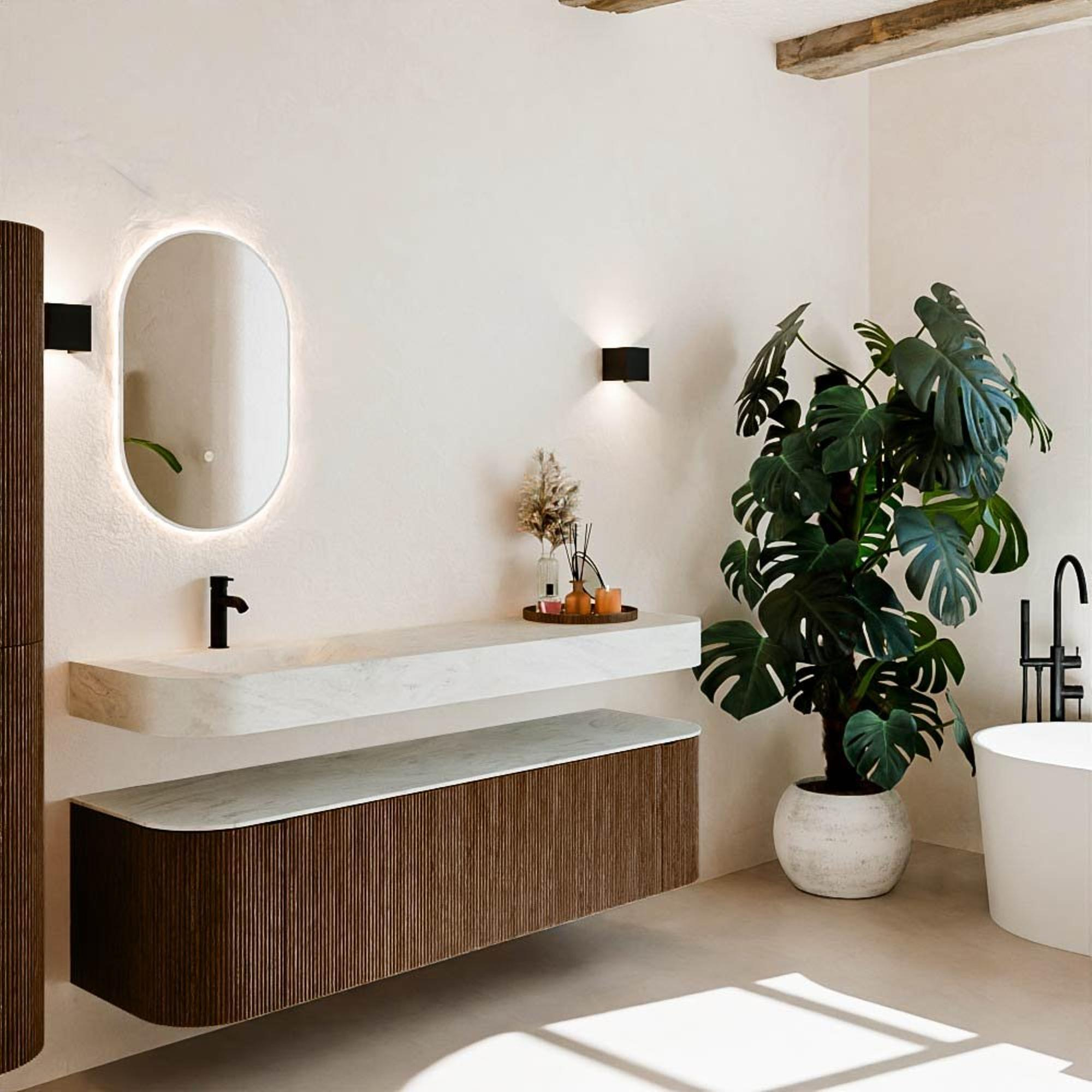 Natuurlijke materialen in warme tinten. De verticale ribbels brengen ritme en textuur in het ontwerp, terwijl het eikenhout zorgt voor een warme, ambachtelijke uitstraling. Kies uit 5 houttinten OAK, WALNUT, DUSK, SHADOW en RUBY zorgvuldig geselecteerde houtkleuren om zowel moderne als klassieke badkamers te verrijken.