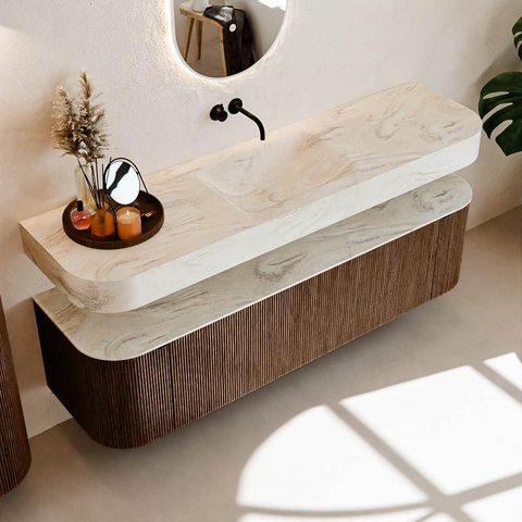 Boven het meubel zweeft een bijpassende, vrij hangende wastafel met afgeronde hoeken – perfect afgestemd op de vorm van de kast. De wastafel is uitgevoerd in Solid Surface en volgt subtiel de lijnen van het onderliggende meubel, waardoor een harmonieus geheel ontstaat. Het Solid Surface topblad vormt een sterke, onderhoudsvriendelijke basis en maakt de combinatie compleet.