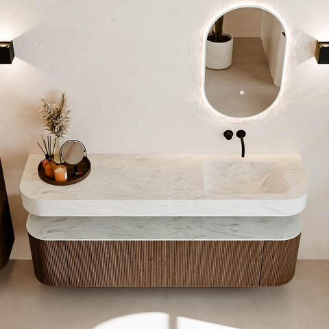 MONDIAZ THOR-DLUX 170cm badmeubel ronding links + rechts kleur Walnut met 1 lade en 2 deuren. Vrijhangende wastafel CLOUD Rechts zonder kraangat kleur Opalo.