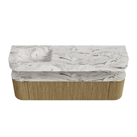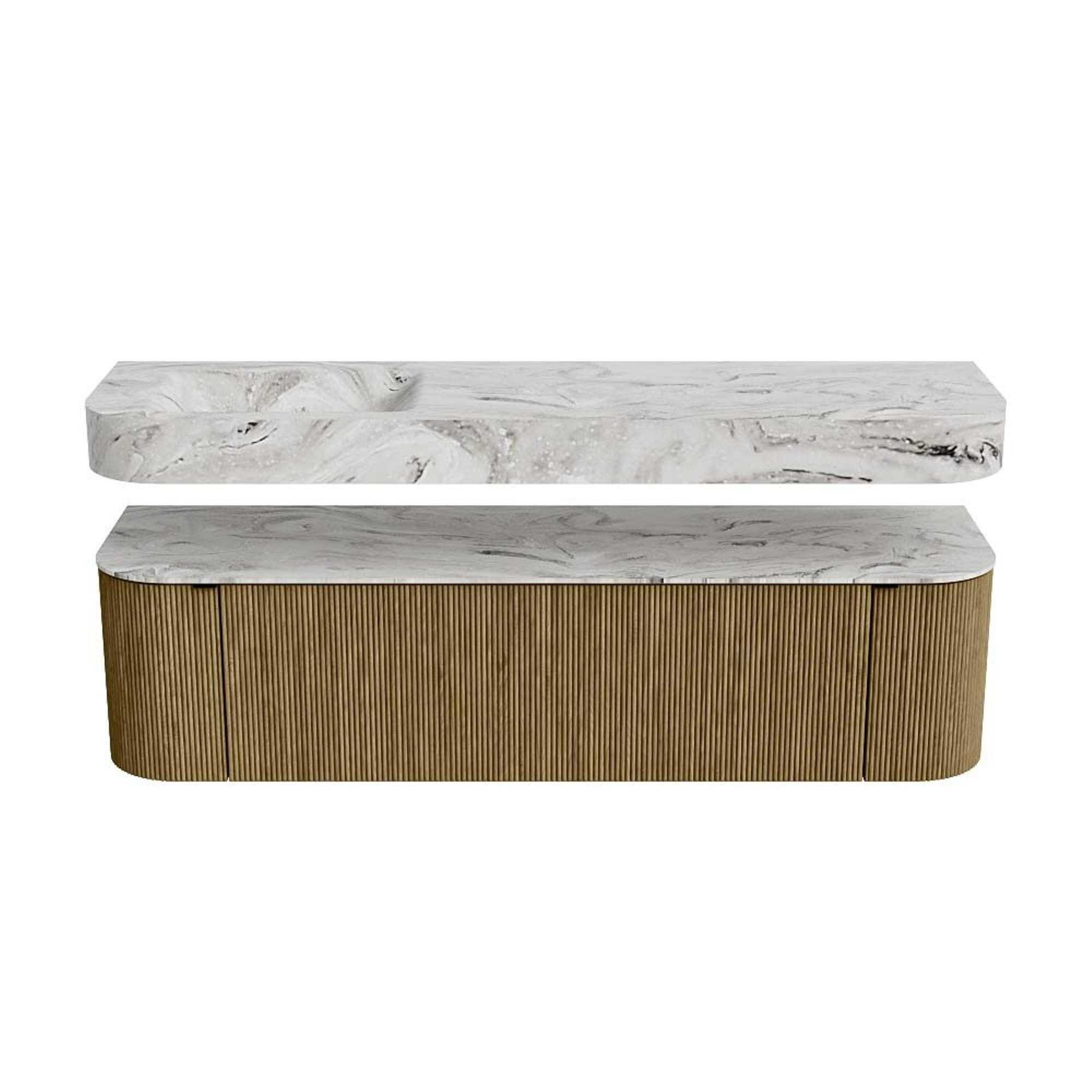Boven het meubel zweeft een bijpassende, vrij hangende wastafel met afgeronde hoeken – perfect afgestemd op de vorm van de kast. De wastafel is uitgevoerd in Solid Surface en volgt subtiel de lijnen van het onderliggende meubel, waardoor een harmonieus geheel ontstaat. Het Solid Surface topblad vormt een sterke, onderhoudsvriendelijke basis en maakt de combinatie compleet.