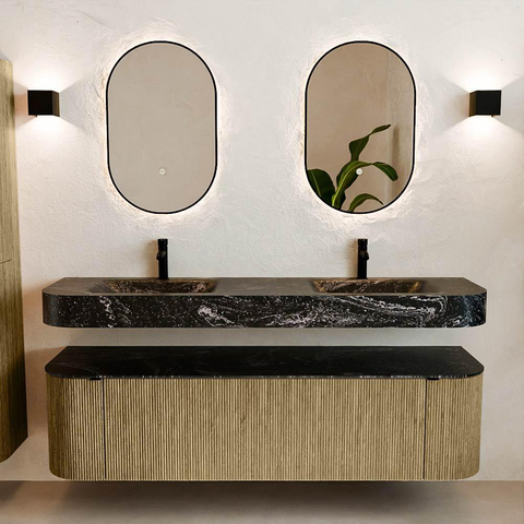 Natuurlijke materialen in warme tinten. De verticale ribbels brengen ritme en textuur in het ontwerp, terwijl het eikenhout zorgt voor een warme, ambachtelijke uitstraling. Kies uit 5 houttinten OAK, WALNUT, DUSK, SHADOW en RUBY zorgvuldig geselecteerde houtkleuren om zowel moderne als klassieke badkamers te verrijken.