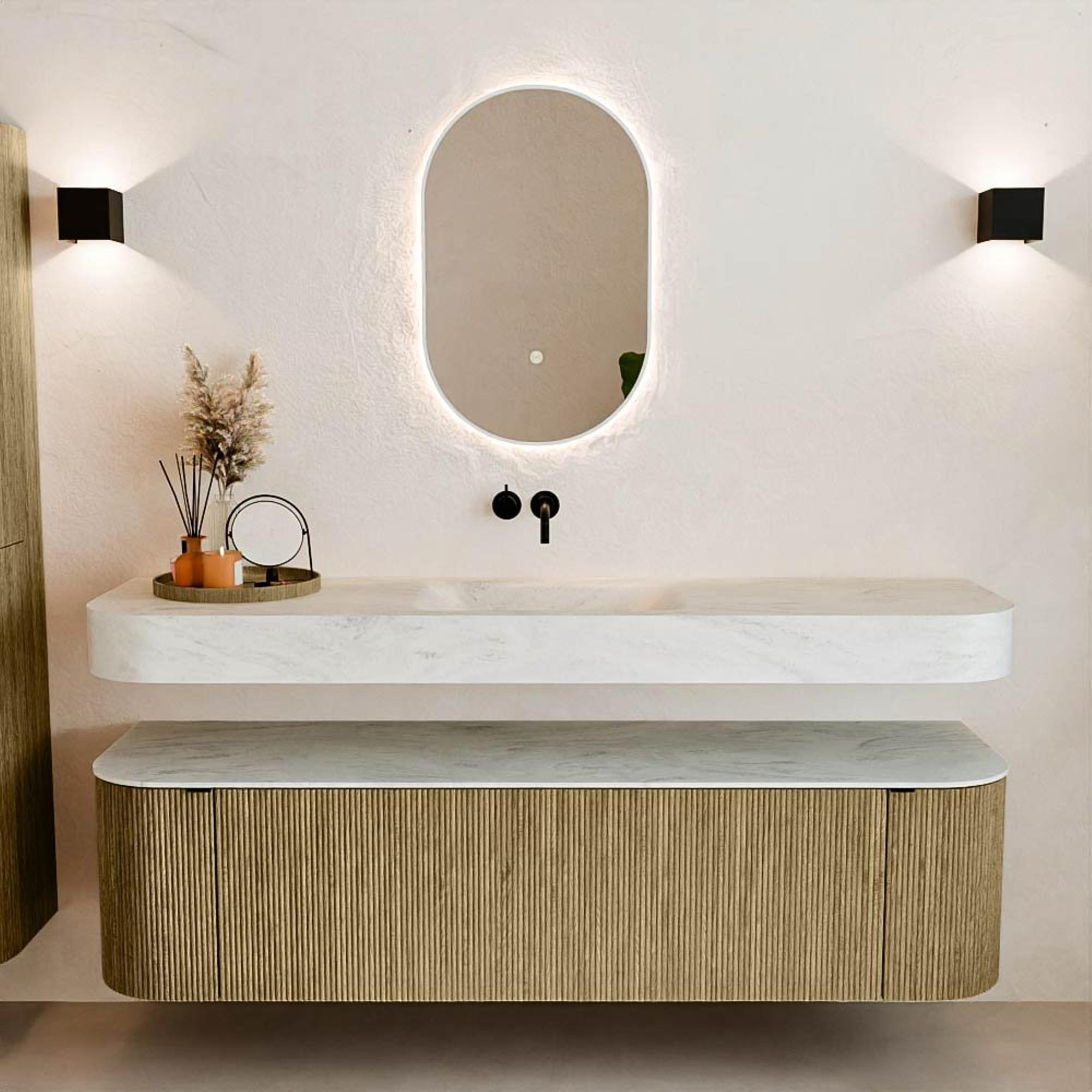 Natuurlijke materialen in warme tinten. De verticale ribbels brengen ritme en textuur in het ontwerp, terwijl het eikenhout zorgt voor een warme, ambachtelijke uitstraling. Kies uit 5 houttinten OAK, WALNUT, DUSK, SHADOW en RUBY zorgvuldig geselecteerde houtkleuren om zowel moderne als klassieke badkamers te verrijken.