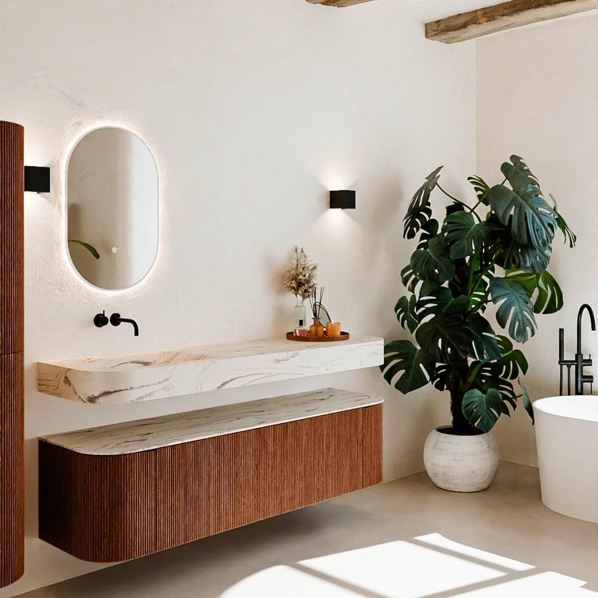 Natuurlijke materialen in warme tinten. De verticale ribbels brengen ritme en textuur in het ontwerp, terwijl het eikenhout zorgt voor een warme, ambachtelijke uitstraling. Kies uit 5 houttinten OAK, WALNUT, DUSK, SHADOW en RUBY zorgvuldig geselecteerde houtkleuren om zowel moderne als klassieke badkamers te verrijken.