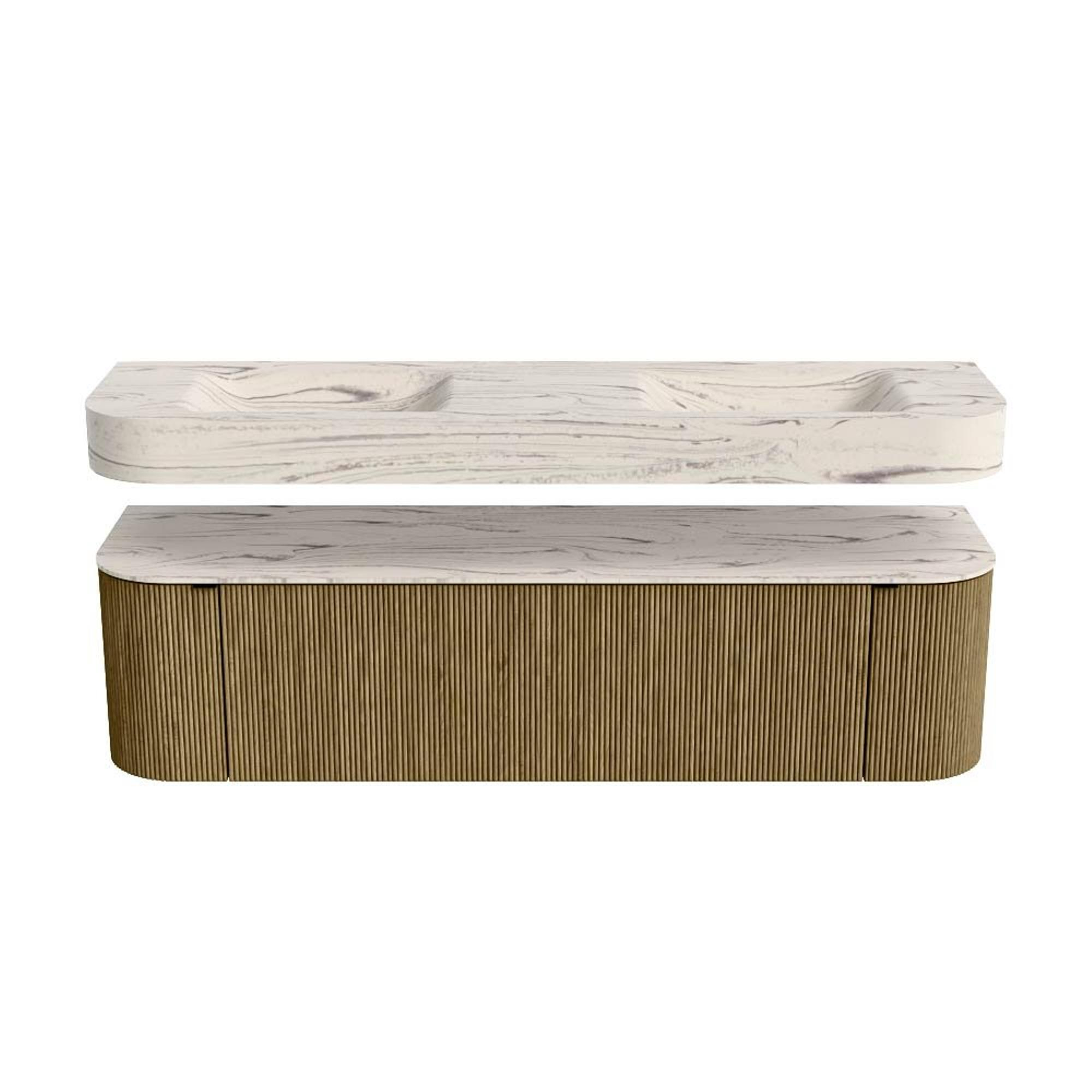 MONDIAZ THOR-DLUX 170cm badmeubel ronding links + rechts kleur Dusk met 1 lade en 2 deuren. Vrijhangende wastafel CLOUD Dubbel 2 kraangaten kleur Nata.