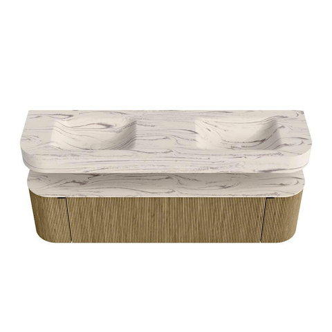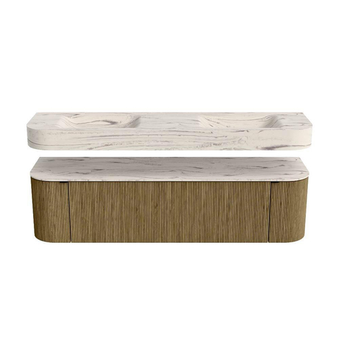 Boven het meubel zweeft een bijpassende, vrij hangende wastafel met afgeronde hoeken – perfect afgestemd op de vorm van de kast. De wastafel is uitgevoerd in Solid Surface en volgt subtiel de lijnen van het onderliggende meubel, waardoor een harmonieus geheel ontstaat. Het Solid Surface topblad vormt een sterke, onderhoudsvriendelijke basis en maakt de combinatie compleet.