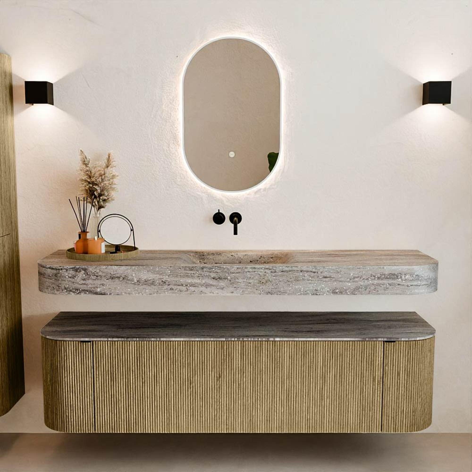 Natuurlijke materialen in warme tinten. De verticale ribbels brengen ritme en textuur in het ontwerp, terwijl het eikenhout zorgt voor een warme, ambachtelijke uitstraling. Kies uit 5 houttinten OAK, WALNUT, DUSK, SHADOW en RUBY zorgvuldig geselecteerde houtkleuren om zowel moderne als klassieke badkamers te verrijken.