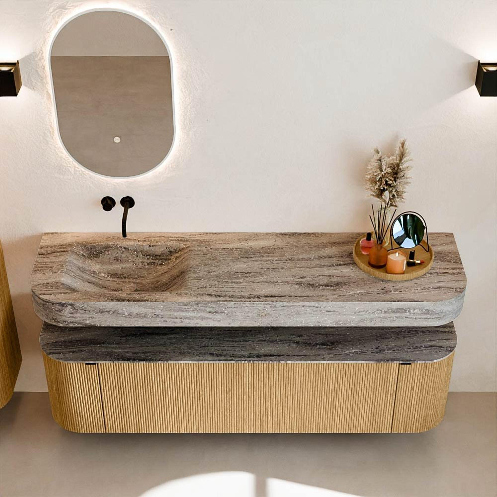 Natuurlijke materialen in warme tinten. De verticale ribbels brengen ritme en textuur in het ontwerp, terwijl het eikenhout zorgt voor een warme, ambachtelijke uitstraling. Kies uit 5 houttinten OAK, WALNUT, DUSK, SHADOW en RUBY zorgvuldig geselecteerde houtkleuren om zowel moderne als klassieke badkamers te verrijken.