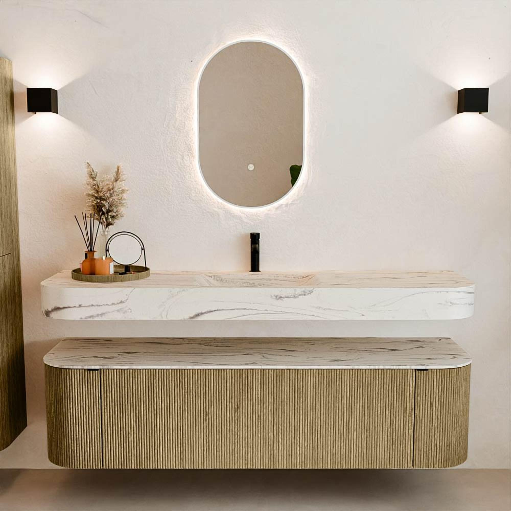 Natuurlijke materialen in warme tinten. De verticale ribbels brengen ritme en textuur in het ontwerp, terwijl het eikenhout zorgt voor een warme, ambachtelijke uitstraling. Kies uit 5 houttinten OAK, WALNUT, DUSK, SHADOW en RUBY zorgvuldig geselecteerde houtkleuren om zowel moderne als klassieke badkamers te verrijken.