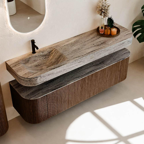 Natuurlijke materialen in warme tinten. De verticale ribbels brengen ritme en textuur in het ontwerp, terwijl het eikenhout zorgt voor een warme, ambachtelijke uitstraling. Kies uit 5 houttinten OAK, WALNUT, DUSK, SHADOW en RUBY zorgvuldig geselecteerde houtkleuren om zowel moderne als klassieke badkamers te verrijken.