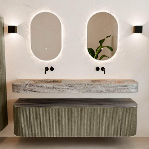 Natuurlijke materialen in warme tinten. De verticale ribbels brengen ritme en textuur in het ontwerp, terwijl het eikenhout zorgt voor een warme, ambachtelijke uitstraling. Kies uit 5 houttinten OAK, WALNUT, DUSK, SHADOW en RUBY zorgvuldig geselecteerde houtkleuren om zowel moderne als klassieke badkamers te verrijken.