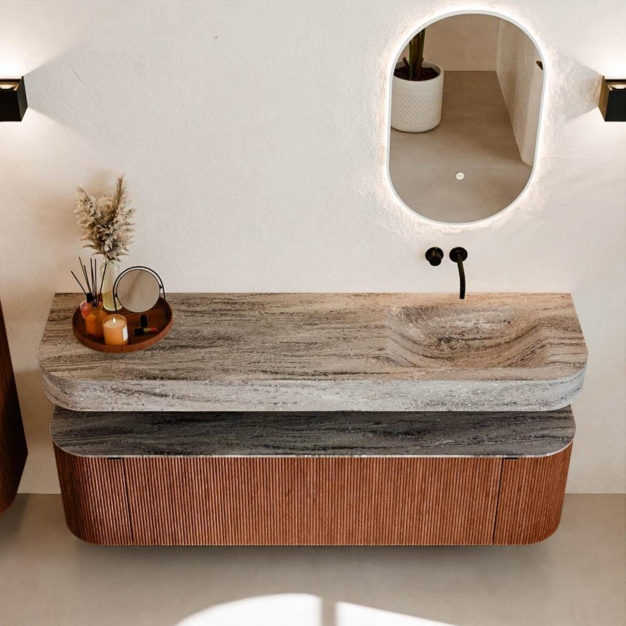 Natuurlijke materialen in warme tinten. De verticale ribbels brengen ritme en textuur in het ontwerp, terwijl het eikenhout zorgt voor een warme, ambachtelijke uitstraling. Kies uit 5 houttinten OAK, WALNUT, DUSK, SHADOW en RUBY zorgvuldig geselecteerde houtkleuren om zowel moderne als klassieke badkamers te verrijken.