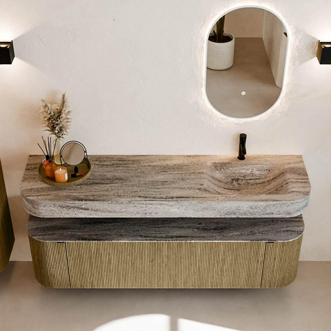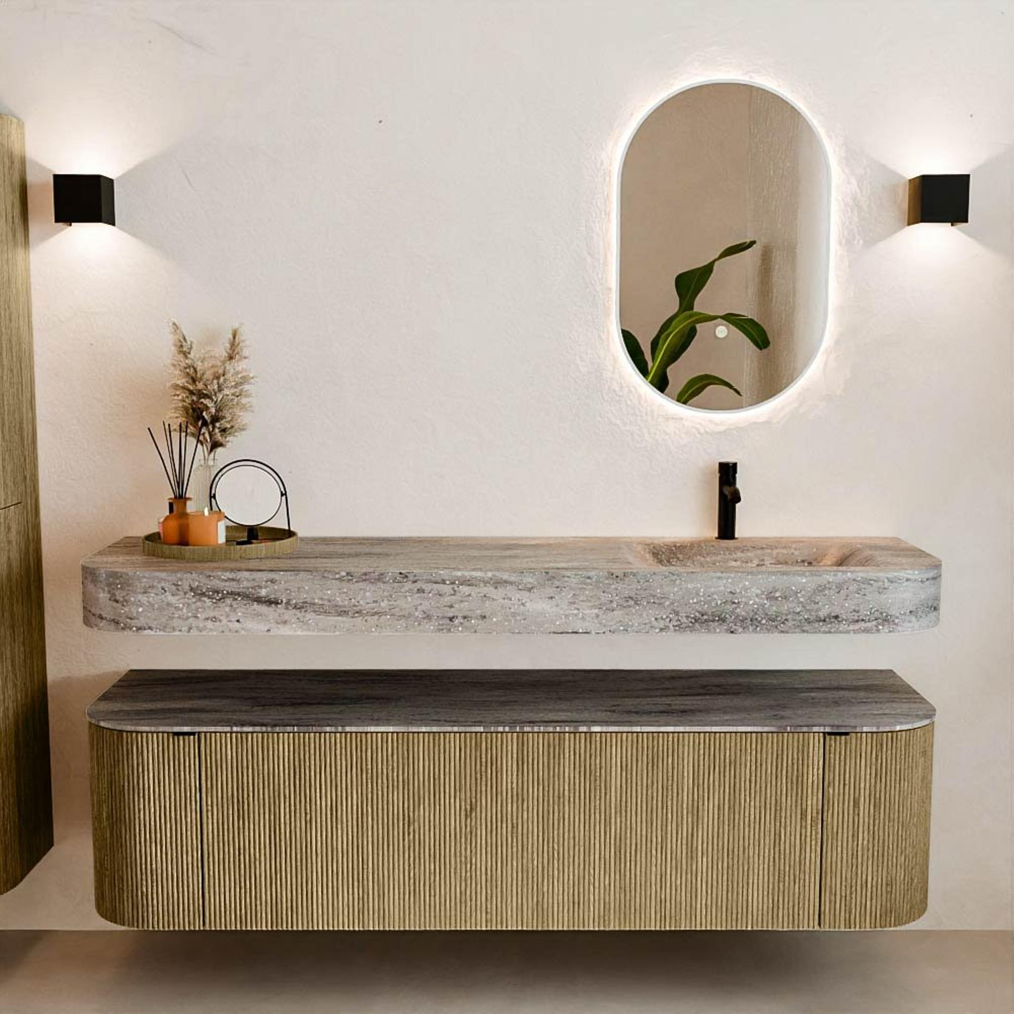 Natuurlijke materialen in warme tinten. De verticale ribbels brengen ritme en textuur in het ontwerp, terwijl het eikenhout zorgt voor een warme, ambachtelijke uitstraling. Kies uit 5 houttinten OAK, WALNUT, DUSK, SHADOW en RUBY zorgvuldig geselecteerde houtkleuren om zowel moderne als klassieke badkamers te verrijken.