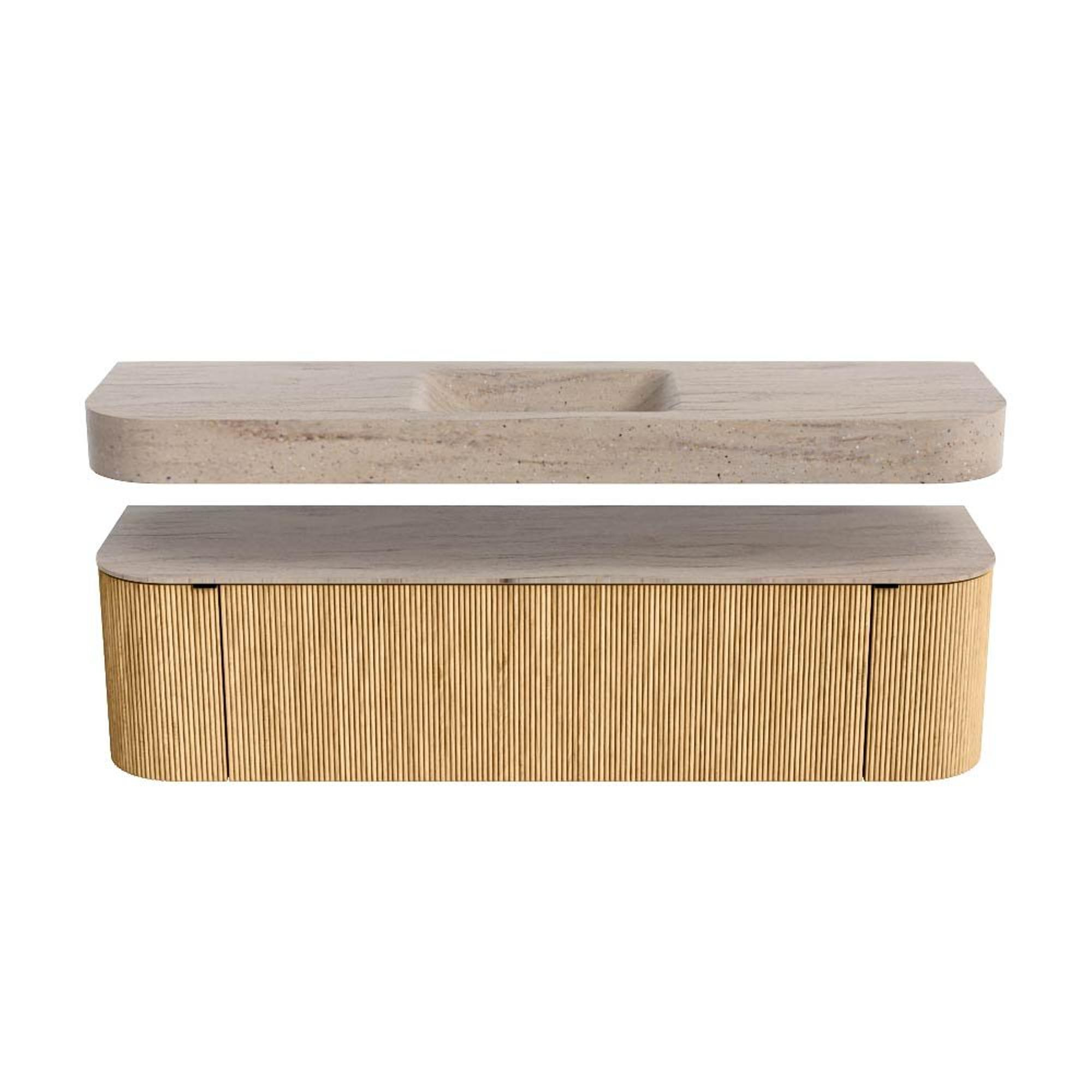 Boven het meubel zweeft een bijpassende, vrij hangende wastafel met afgeronde hoeken – perfect afgestemd op de vorm van de kast. De wastafel is uitgevoerd in Solid Surface en volgt subtiel de lijnen van het onderliggende meubel, waardoor een harmonieus geheel ontstaat. Het Solid Surface topblad vormt een sterke, onderhoudsvriendelijke basis en maakt de combinatie compleet.