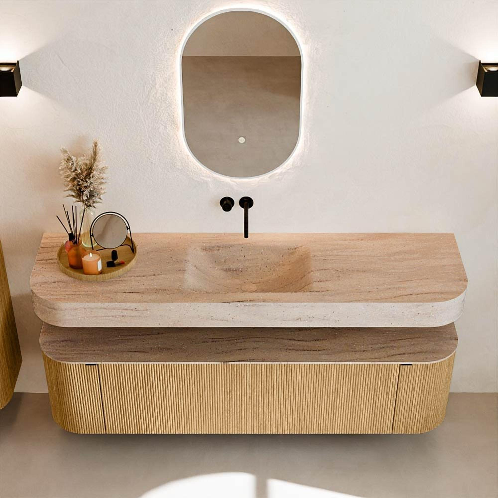 Natuurlijke materialen in warme tinten. De verticale ribbels brengen ritme en textuur in het ontwerp, terwijl het eikenhout zorgt voor een warme, ambachtelijke uitstraling. Kies uit 5 houttinten OAK, WALNUT, DUSK, SHADOW en RUBY zorgvuldig geselecteerde houtkleuren om zowel moderne als klassieke badkamers te verrijken.