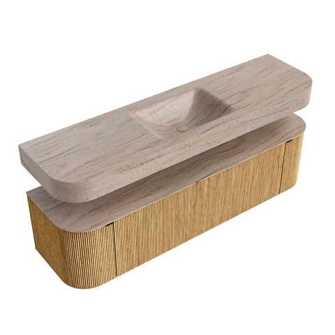 MONDIAZ THOR-DLUX 170cm badmeubel ronding links + rechts kleur Oak met 1 lade en 2 deuren. Vrijhangende wastafel CLOUD Midden zonder kraangat kleur Saba.