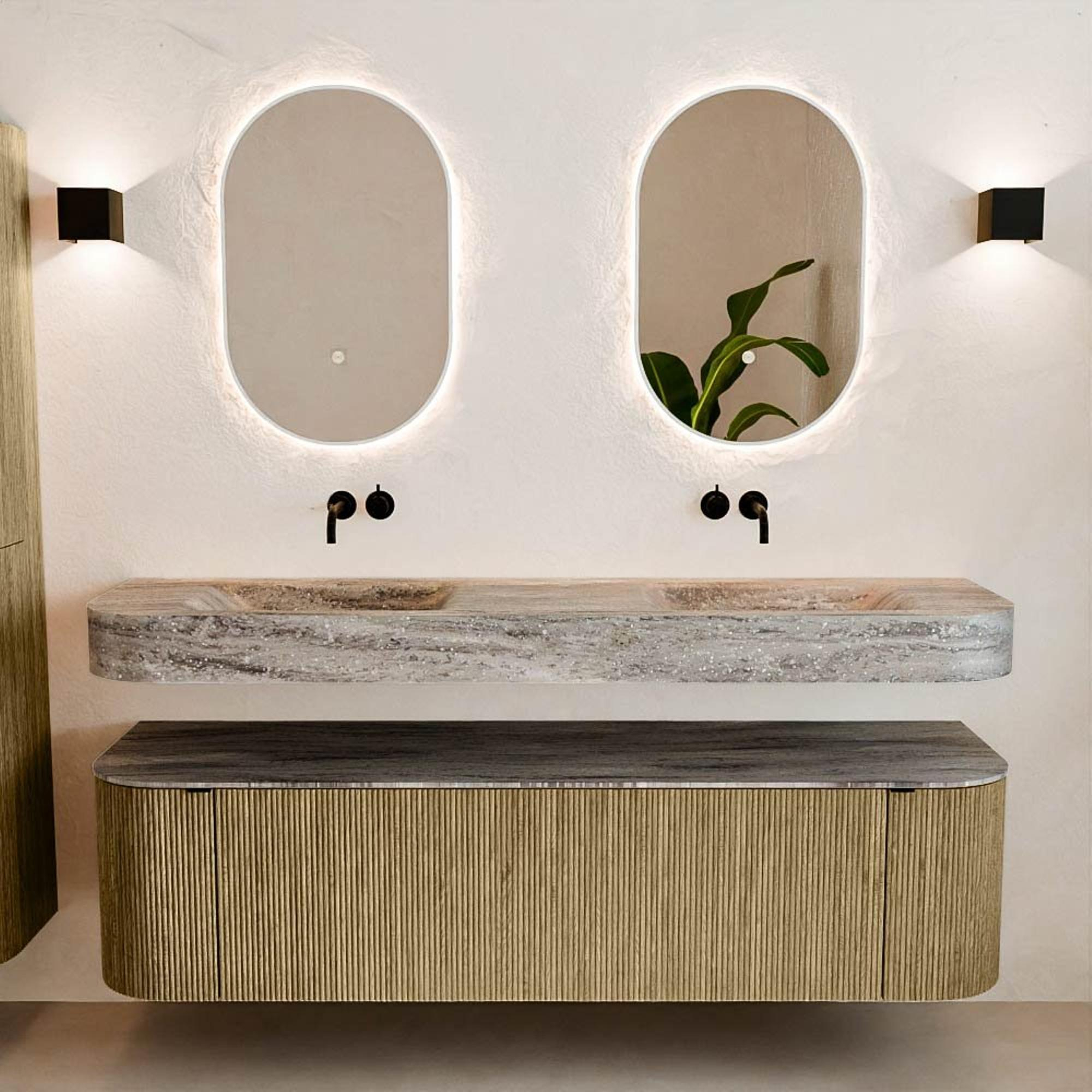 Natuurlijke materialen in warme tinten. De verticale ribbels brengen ritme en textuur in het ontwerp, terwijl het eikenhout zorgt voor een warme, ambachtelijke uitstraling. Kies uit 5 houttinten OAK, WALNUT, DUSK, SHADOW en RUBY zorgvuldig geselecteerde houtkleuren om zowel moderne als klassieke badkamers te verrijken.