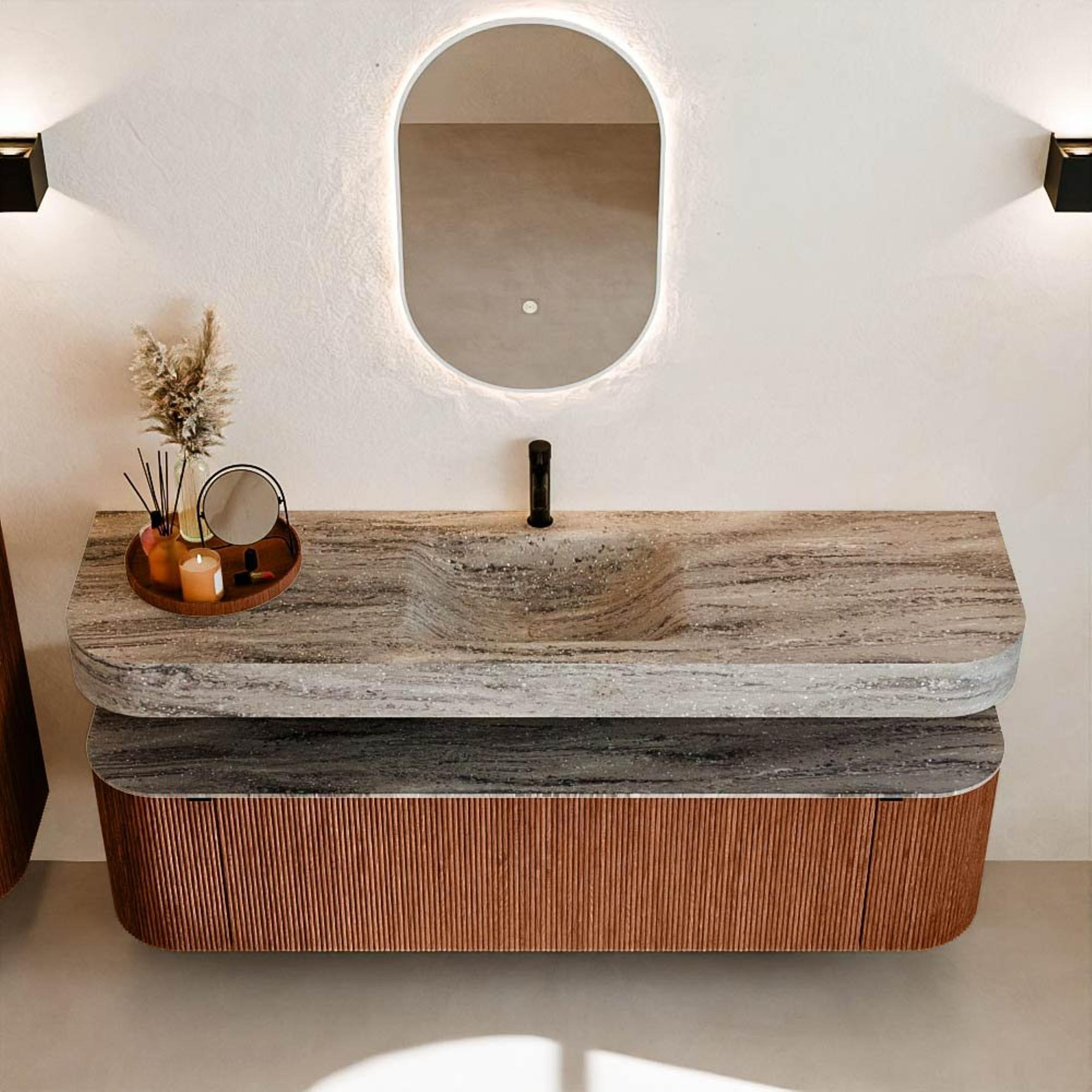 Natuurlijke materialen in warme tinten. De verticale ribbels brengen ritme en textuur in het ontwerp, terwijl het eikenhout zorgt voor een warme, ambachtelijke uitstraling. Kies uit 5 houttinten OAK, WALNUT, DUSK, SHADOW en RUBY zorgvuldig geselecteerde houtkleuren om zowel moderne als klassieke badkamers te verrijken.