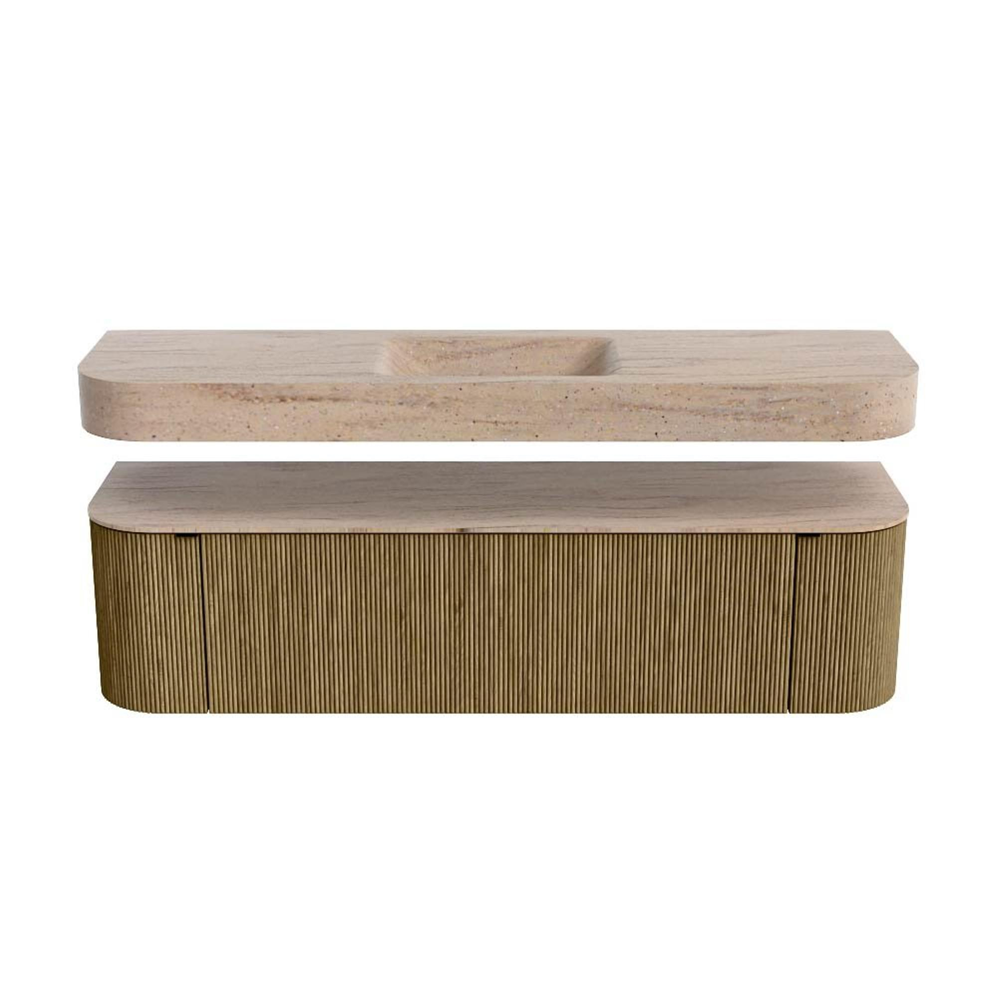 Boven het meubel zweeft een bijpassende, vrij hangende wastafel met afgeronde hoeken – perfect afgestemd op de vorm van de kast. De wastafel is uitgevoerd in Solid Surface en volgt subtiel de lijnen van het onderliggende meubel, waardoor een harmonieus geheel ontstaat. Het Solid Surface topblad vormt een sterke, onderhoudsvriendelijke basis en maakt de combinatie compleet.