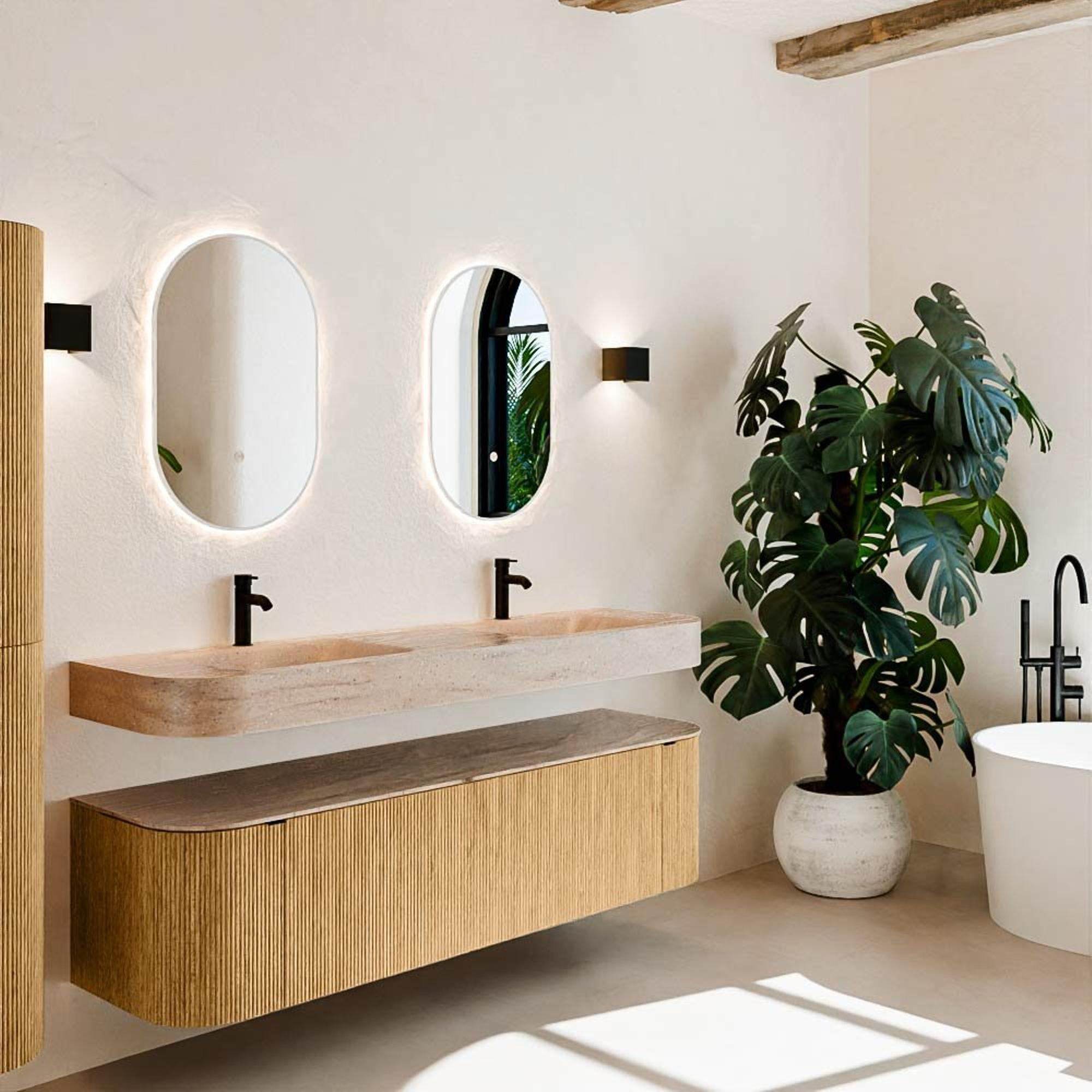 Natuurlijke materialen in warme tinten. De verticale ribbels brengen ritme en textuur in het ontwerp, terwijl het eikenhout zorgt voor een warme, ambachtelijke uitstraling. Kies uit 5 houttinten OAK, WALNUT, DUSK, SHADOW en RUBY zorgvuldig geselecteerde houtkleuren om zowel moderne als klassieke badkamers te verrijken.