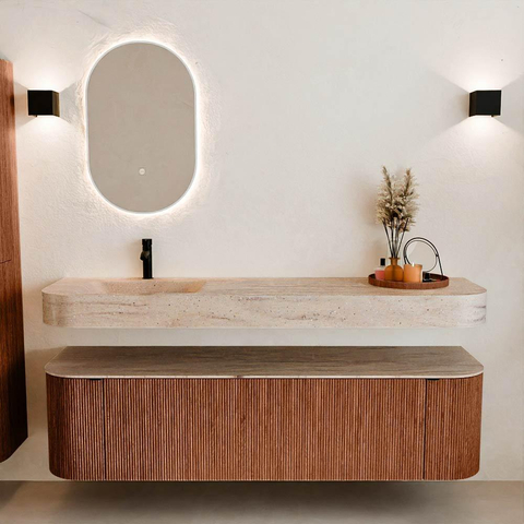 Natuurlijke materialen in warme tinten. De verticale ribbels brengen ritme en textuur in het ontwerp, terwijl het eikenhout zorgt voor een warme, ambachtelijke uitstraling. Kies uit 5 houttinten OAK, WALNUT, DUSK, SHADOW en RUBY zorgvuldig geselecteerde houtkleuren om zowel moderne als klassieke badkamers te verrijken.