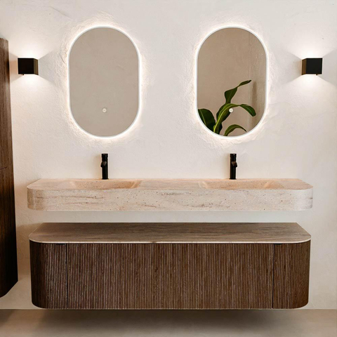 Natuurlijke materialen in warme tinten. De verticale ribbels brengen ritme en textuur in het ontwerp, terwijl het eikenhout zorgt voor een warme, ambachtelijke uitstraling. Kies uit 5 houttinten OAK, WALNUT, DUSK, SHADOW en RUBY zorgvuldig geselecteerde houtkleuren om zowel moderne als klassieke badkamers te verrijken.