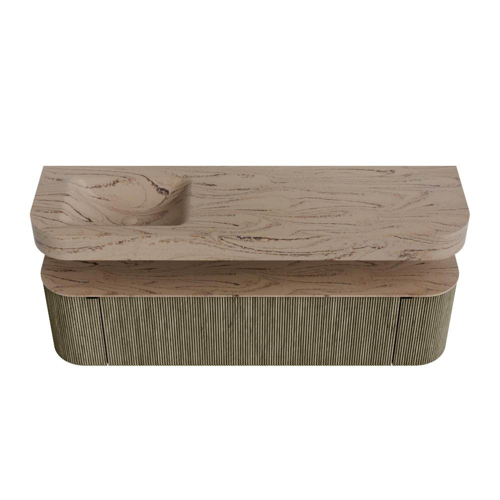 Boven het meubel zweeft een bijpassende, vrij hangende wastafel met afgeronde hoeken – perfect afgestemd op de vorm van de kast. De wastafel is uitgevoerd in Solid Surface en volgt subtiel de lijnen van het onderliggende meubel, waardoor een harmonieus geheel ontstaat. Het Solid Surface topblad vormt een sterke, onderhoudsvriendelijke basis en maakt de combinatie compleet.