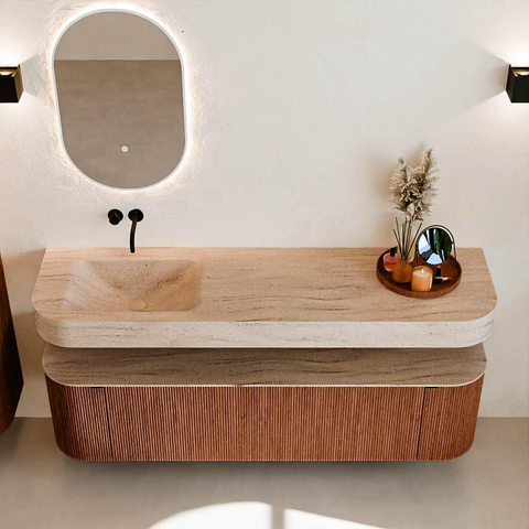 Natuurlijke materialen in warme tinten. De verticale ribbels brengen ritme en textuur in het ontwerp, terwijl het eikenhout zorgt voor een warme, ambachtelijke uitstraling. Kies uit 5 houttinten OAK, WALNUT, DUSK, SHADOW en RUBY zorgvuldig geselecteerde houtkleuren om zowel moderne als klassieke badkamers te verrijken.