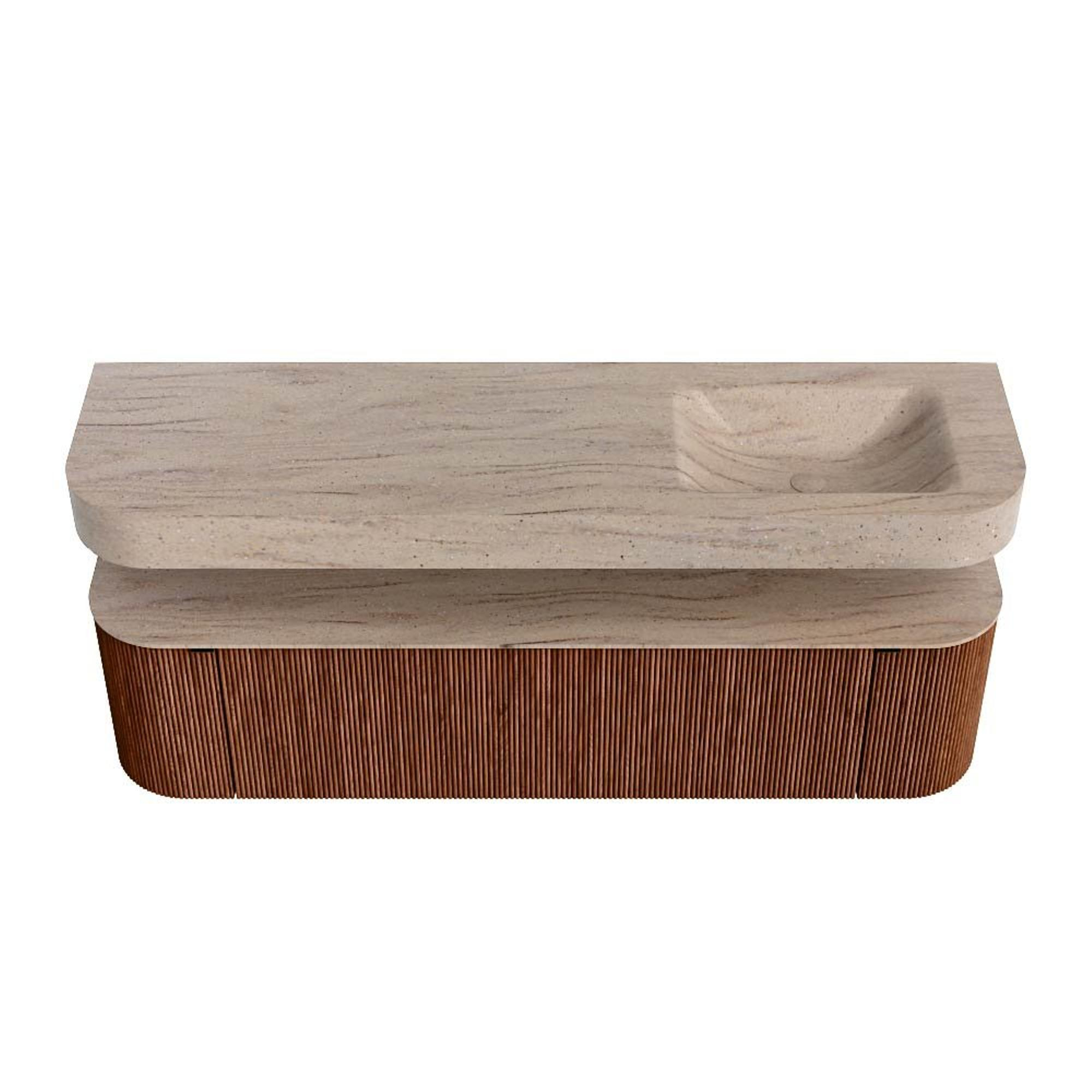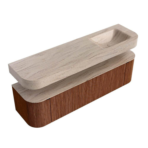 Boven het meubel zweeft een bijpassende, vrij hangende wastafel met afgeronde hoeken – perfect afgestemd op de vorm van de kast. De wastafel is uitgevoerd in Solid Surface en volgt subtiel de lijnen van het onderliggende meubel, waardoor een harmonieus geheel ontstaat. Het Solid Surface topblad vormt een sterke, onderhoudsvriendelijke basis en maakt de combinatie compleet.