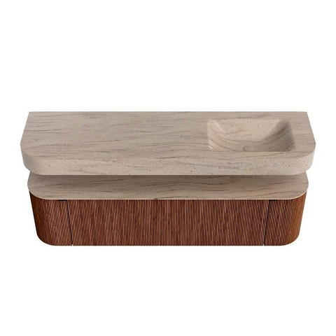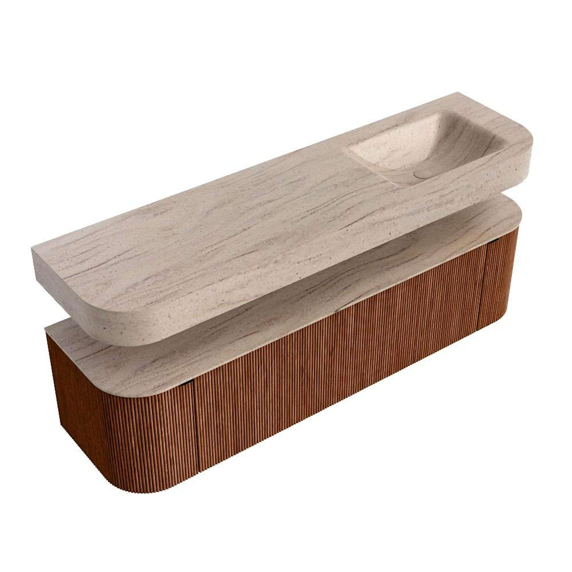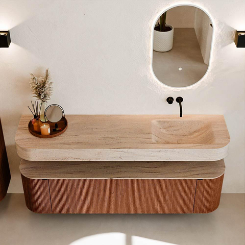 Natuurlijke materialen in warme tinten. De verticale ribbels brengen ritme en textuur in het ontwerp, terwijl het eikenhout zorgt voor een warme, ambachtelijke uitstraling. Kies uit 5 houttinten OAK, WALNUT, DUSK, SHADOW en RUBY zorgvuldig geselecteerde houtkleuren om zowel moderne als klassieke badkamers te verrijken.