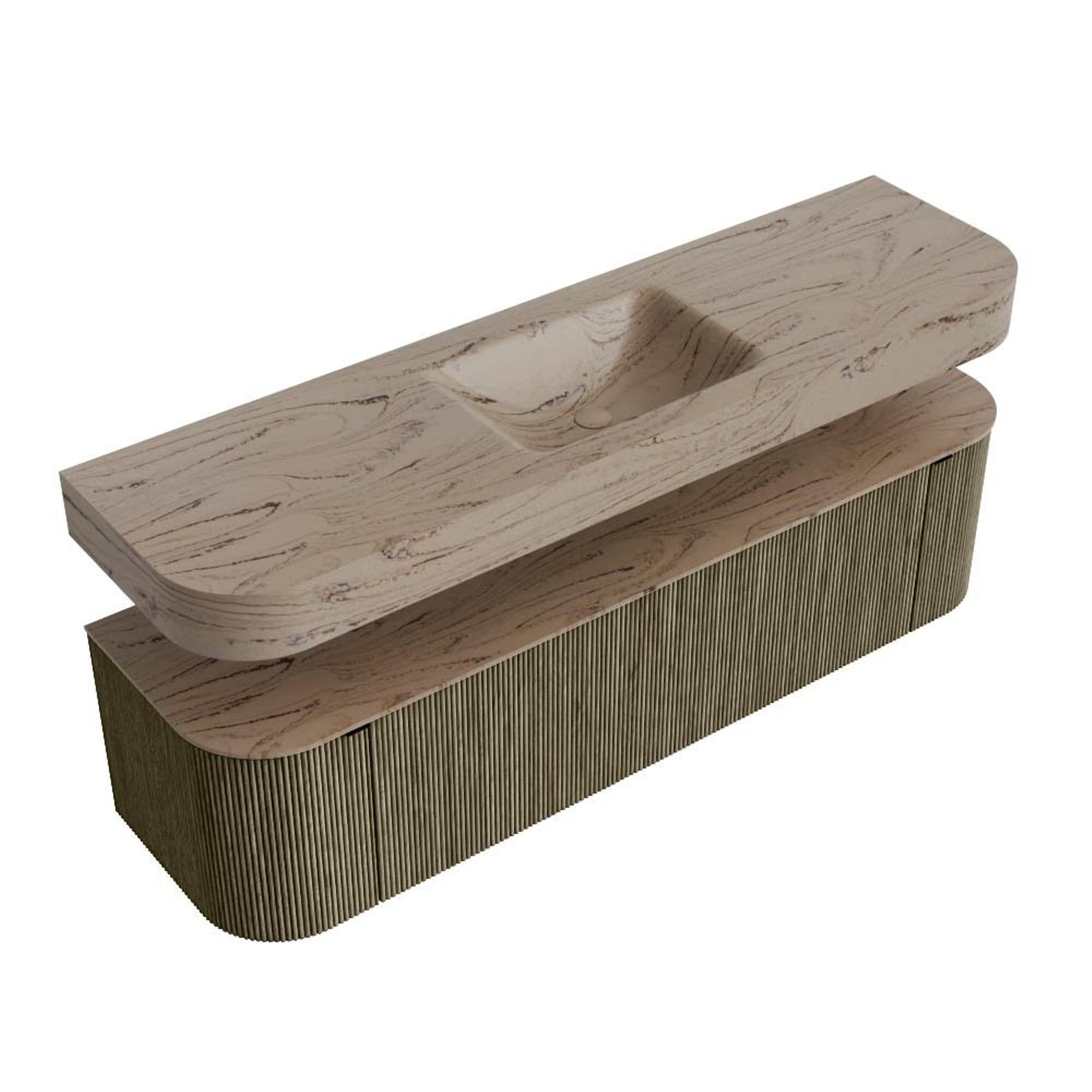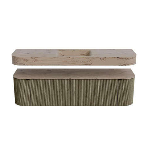 Boven het meubel zweeft een bijpassende, vrij hangende wastafel met afgeronde hoeken – perfect afgestemd op de vorm van de kast. De wastafel is uitgevoerd in Solid Surface en volgt subtiel de lijnen van het onderliggende meubel, waardoor een harmonieus geheel ontstaat. Het Solid Surface topblad vormt een sterke, onderhoudsvriendelijke basis en maakt de combinatie compleet.