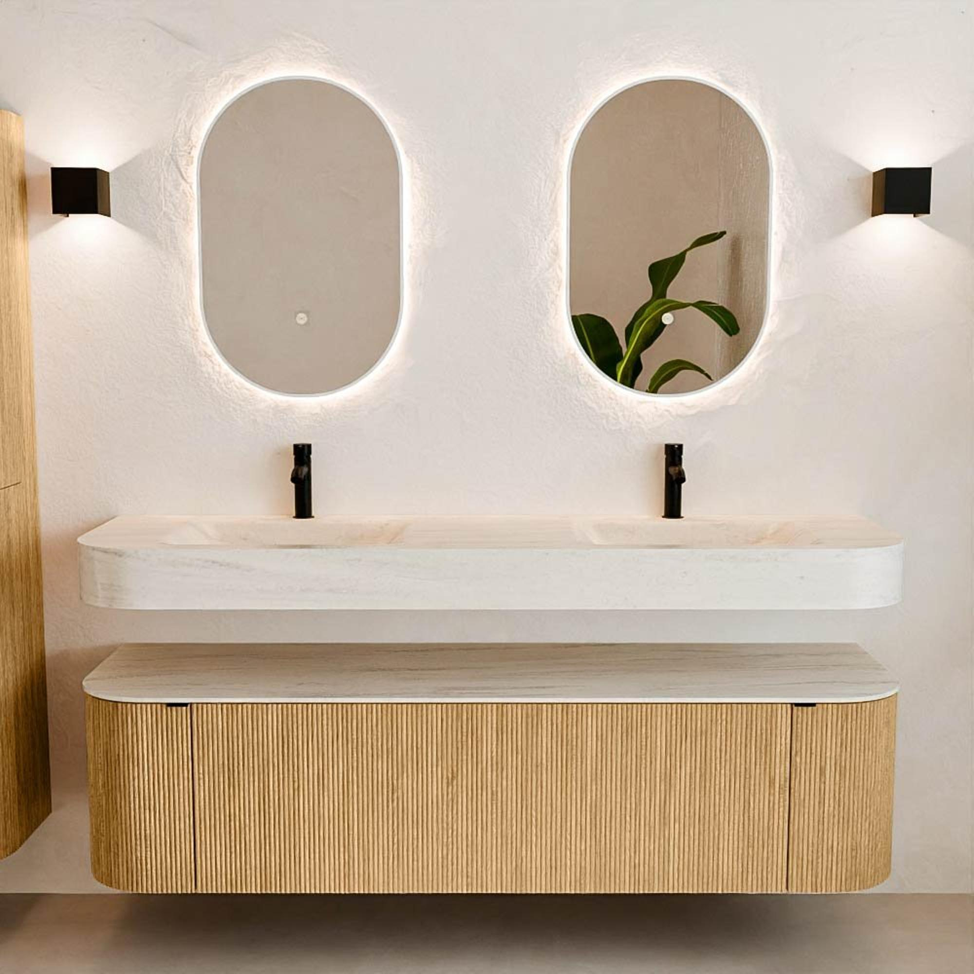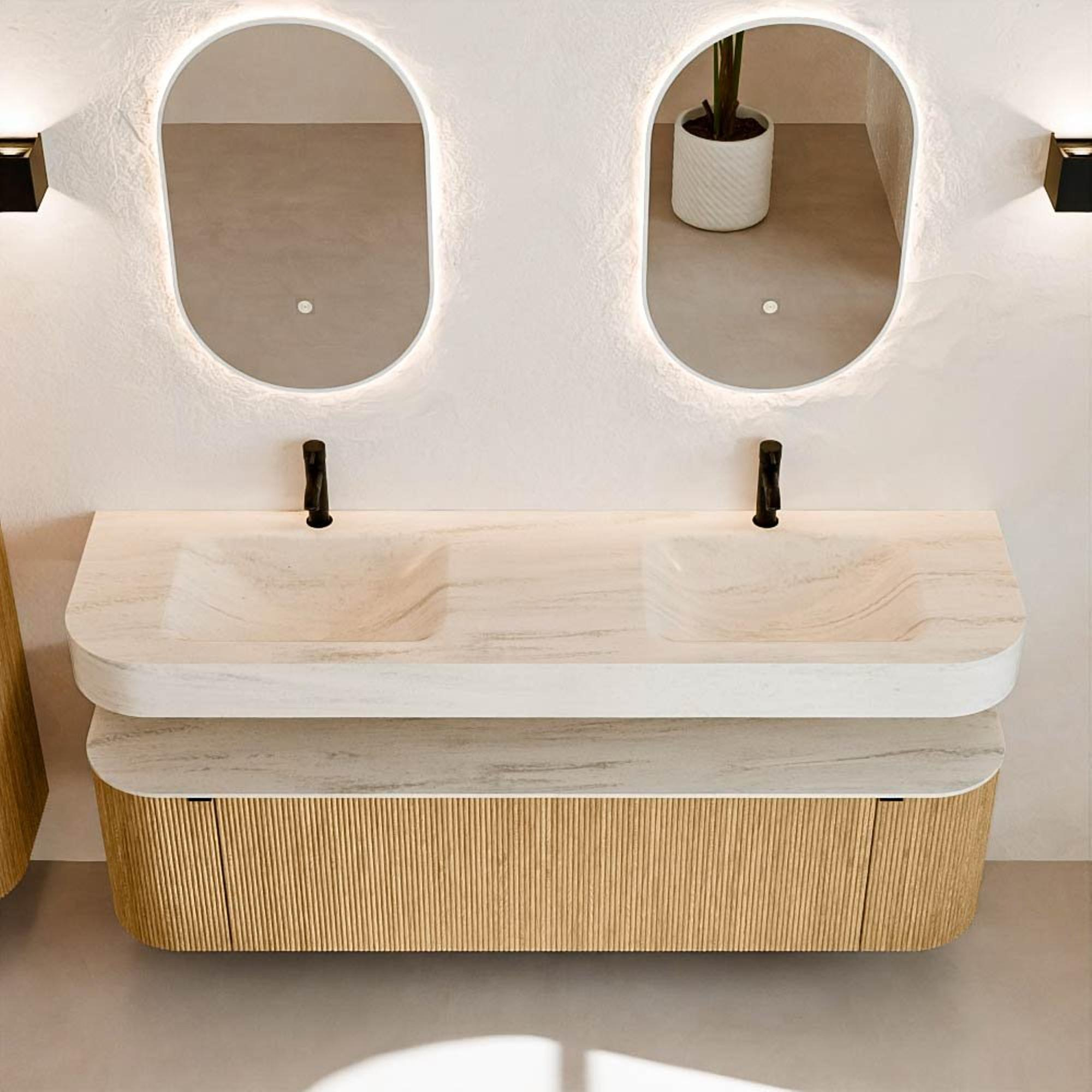 Natuurlijke materialen in warme tinten. De verticale ribbels brengen ritme en textuur in het ontwerp, terwijl het eikenhout zorgt voor een warme, ambachtelijke uitstraling. Kies uit 5 houttinten OAK, WALNUT, DUSK, SHADOW en RUBY zorgvuldig geselecteerde houtkleuren om zowel moderne als klassieke badkamers te verrijken.