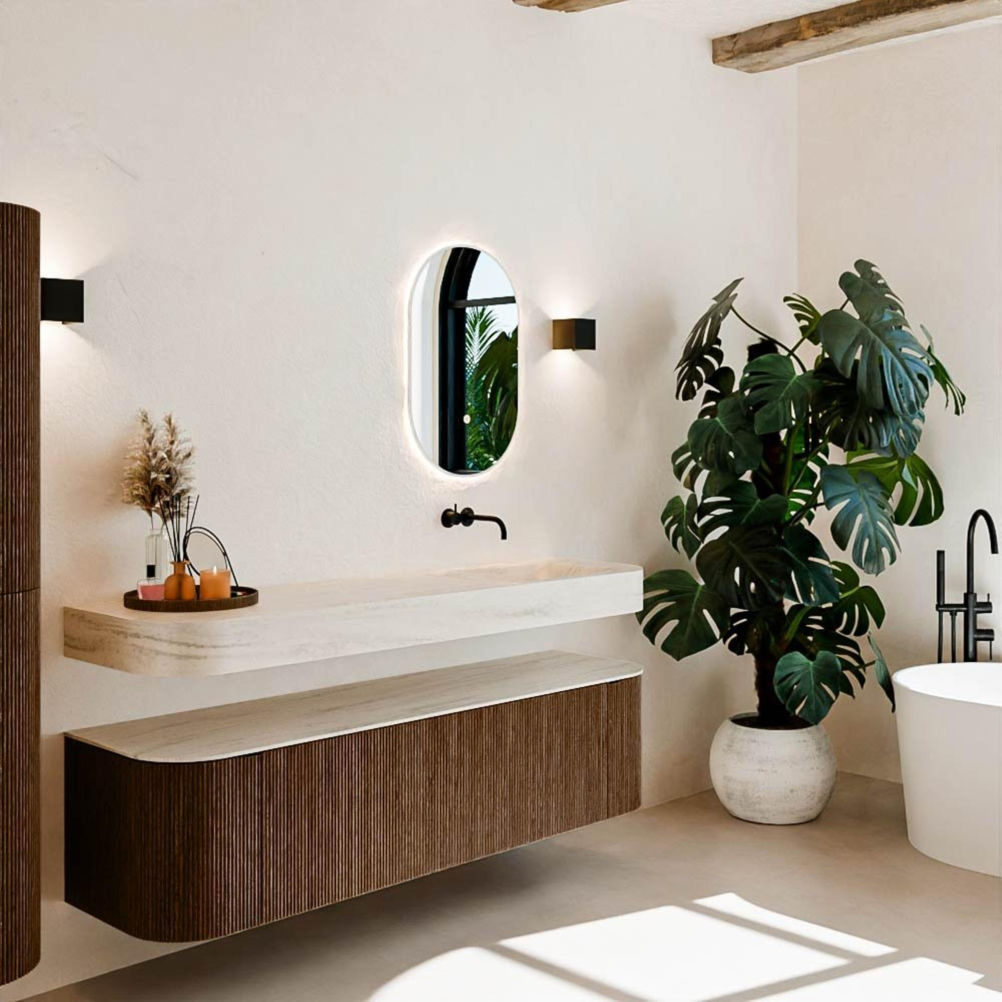 Natuurlijke materialen in warme tinten. De verticale ribbels brengen ritme en textuur in het ontwerp, terwijl het eikenhout zorgt voor een warme, ambachtelijke uitstraling. Kies uit 5 houttinten OAK, WALNUT, DUSK, SHADOW en RUBY zorgvuldig geselecteerde houtkleuren om zowel moderne als klassieke badkamers te verrijken.