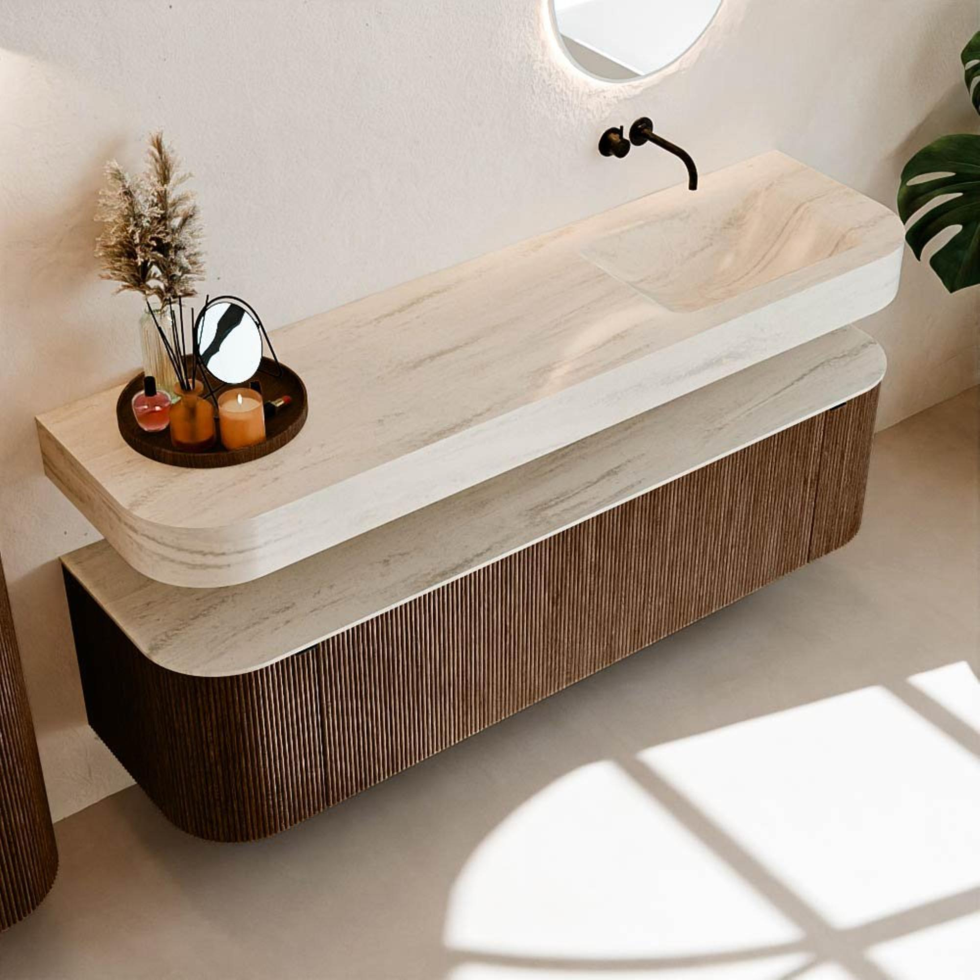 Boven het meubel zweeft een bijpassende, vrij hangende wastafel met afgeronde hoeken – perfect afgestemd op de vorm van de kast. De wastafel is uitgevoerd in Solid Surface en volgt subtiel de lijnen van het onderliggende meubel, waardoor een harmonieus geheel ontstaat. Het Solid Surface topblad vormt een sterke, onderhoudsvriendelijke basis en maakt de combinatie compleet.