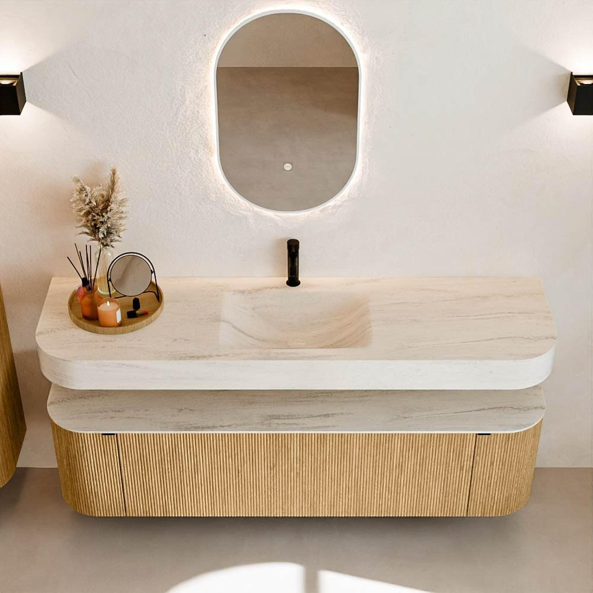 Natuurlijke materialen in warme tinten. De verticale ribbels brengen ritme en textuur in het ontwerp, terwijl het eikenhout zorgt voor een warme, ambachtelijke uitstraling. Kies uit 5 houttinten OAK, WALNUT, DUSK, SHADOW en RUBY zorgvuldig geselecteerde houtkleuren om zowel moderne als klassieke badkamers te verrijken.