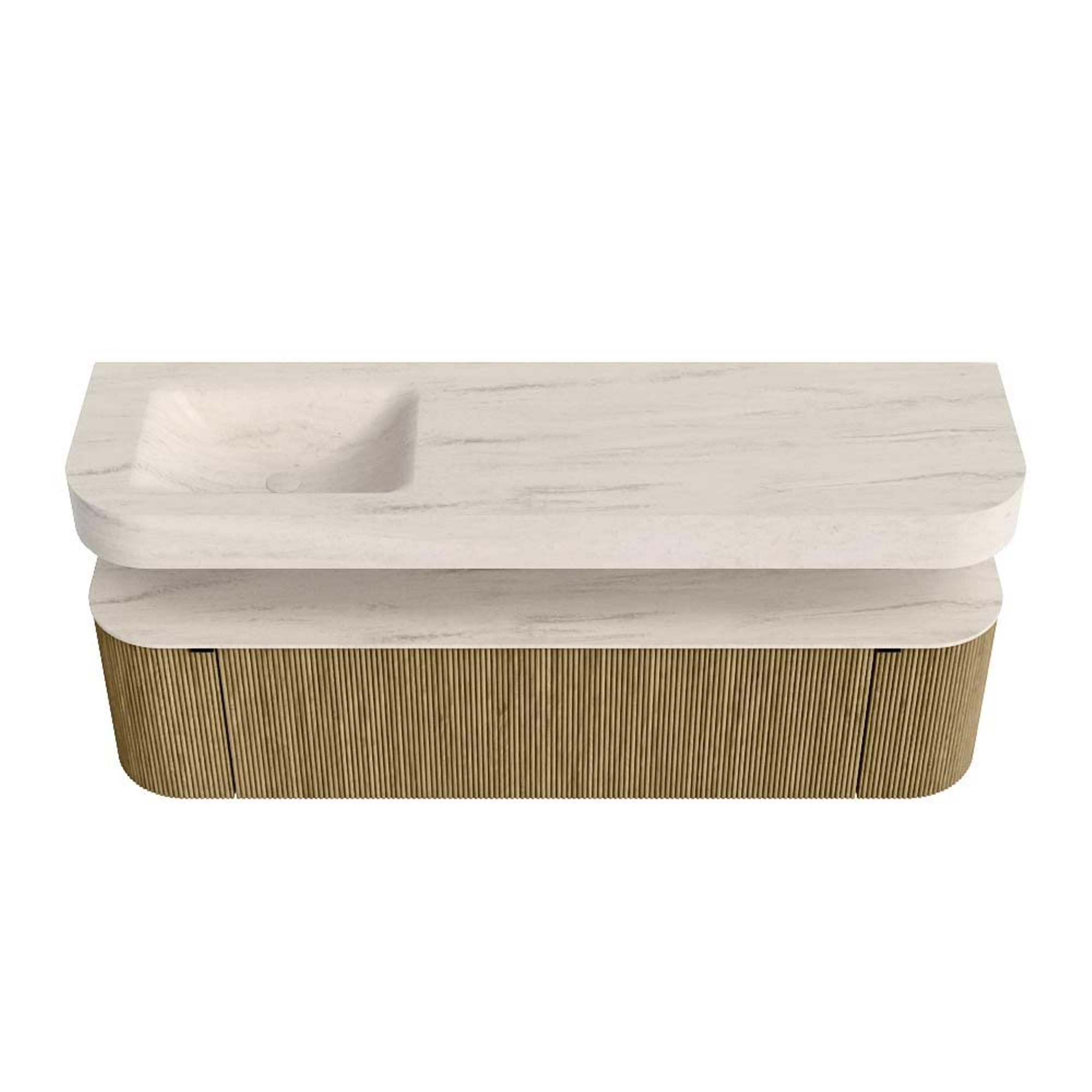 Boven het meubel zweeft een bijpassende, vrij hangende wastafel met afgeronde hoeken – perfect afgestemd op de vorm van de kast. De wastafel is uitgevoerd in Solid Surface en volgt subtiel de lijnen van het onderliggende meubel, waardoor een harmonieus geheel ontstaat. Het Solid Surface topblad vormt een sterke, onderhoudsvriendelijke basis en maakt de combinatie compleet.