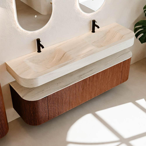MONDIAZ THOR-DLUX 170cm badmeubel ronding links + rechts kleur Ruby met 1 lade en 2 deuren. Vrijhangende wastafel CLOUD Dubbel 2 kraangaten kleur Meli.