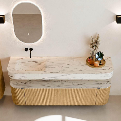 Boven het meubel zweeft een bijpassende, vrij hangende wastafel met afgeronde hoeken – perfect afgestemd op de vorm van de kast. De wastafel is uitgevoerd in Solid Surface en volgt subtiel de lijnen van het onderliggende meubel, waardoor een harmonieus geheel ontstaat. Het Solid Surface topblad vormt een sterke, onderhoudsvriendelijke basis en maakt de combinatie compleet.