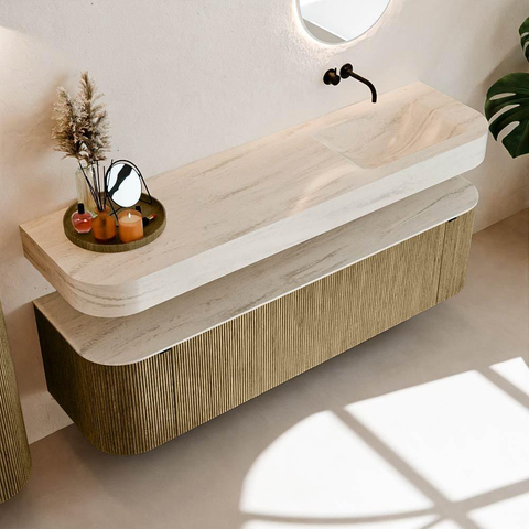 Natuurlijke materialen in warme tinten. De verticale ribbels brengen ritme en textuur in het ontwerp, terwijl het eikenhout zorgt voor een warme, ambachtelijke uitstraling. Kies uit 5 houttinten OAK, WALNUT, DUSK, SHADOW en RUBY zorgvuldig geselecteerde houtkleuren om zowel moderne als klassieke badkamers te verrijken.