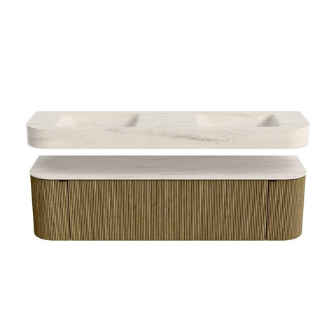 Boven het meubel zweeft een bijpassende, vrij hangende wastafel met afgeronde hoeken – perfect afgestemd op de vorm van de kast. De wastafel is uitgevoerd in Solid Surface en volgt subtiel de lijnen van het onderliggende meubel, waardoor een harmonieus geheel ontstaat. Het Solid Surface topblad vormt een sterke, onderhoudsvriendelijke basis en maakt de combinatie compleet.