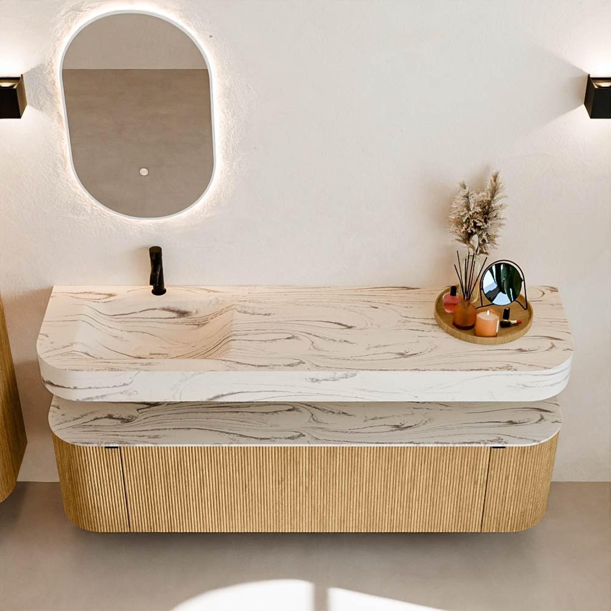 Boven het meubel zweeft een bijpassende, vrij hangende wastafel met afgeronde hoeken – perfect afgestemd op de vorm van de kast. De wastafel is uitgevoerd in Solid Surface en volgt subtiel de lijnen van het onderliggende meubel, waardoor een harmonieus geheel ontstaat. Het Solid Surface topblad vormt een sterke, onderhoudsvriendelijke basis en maakt de combinatie compleet.