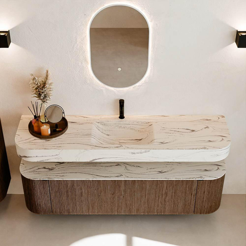 Boven het meubel zweeft een bijpassende, vrij hangende wastafel met afgeronde hoeken – perfect afgestemd op de vorm van de kast. De wastafel is uitgevoerd in Solid Surface en volgt subtiel de lijnen van het onderliggende meubel, waardoor een harmonieus geheel ontstaat. Het Solid Surface topblad vormt een sterke, onderhoudsvriendelijke basis en maakt de combinatie compleet.