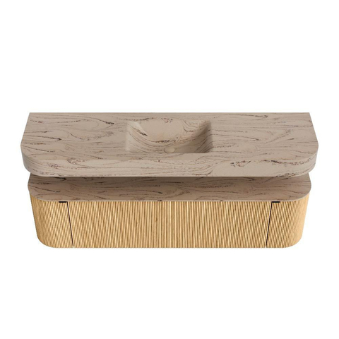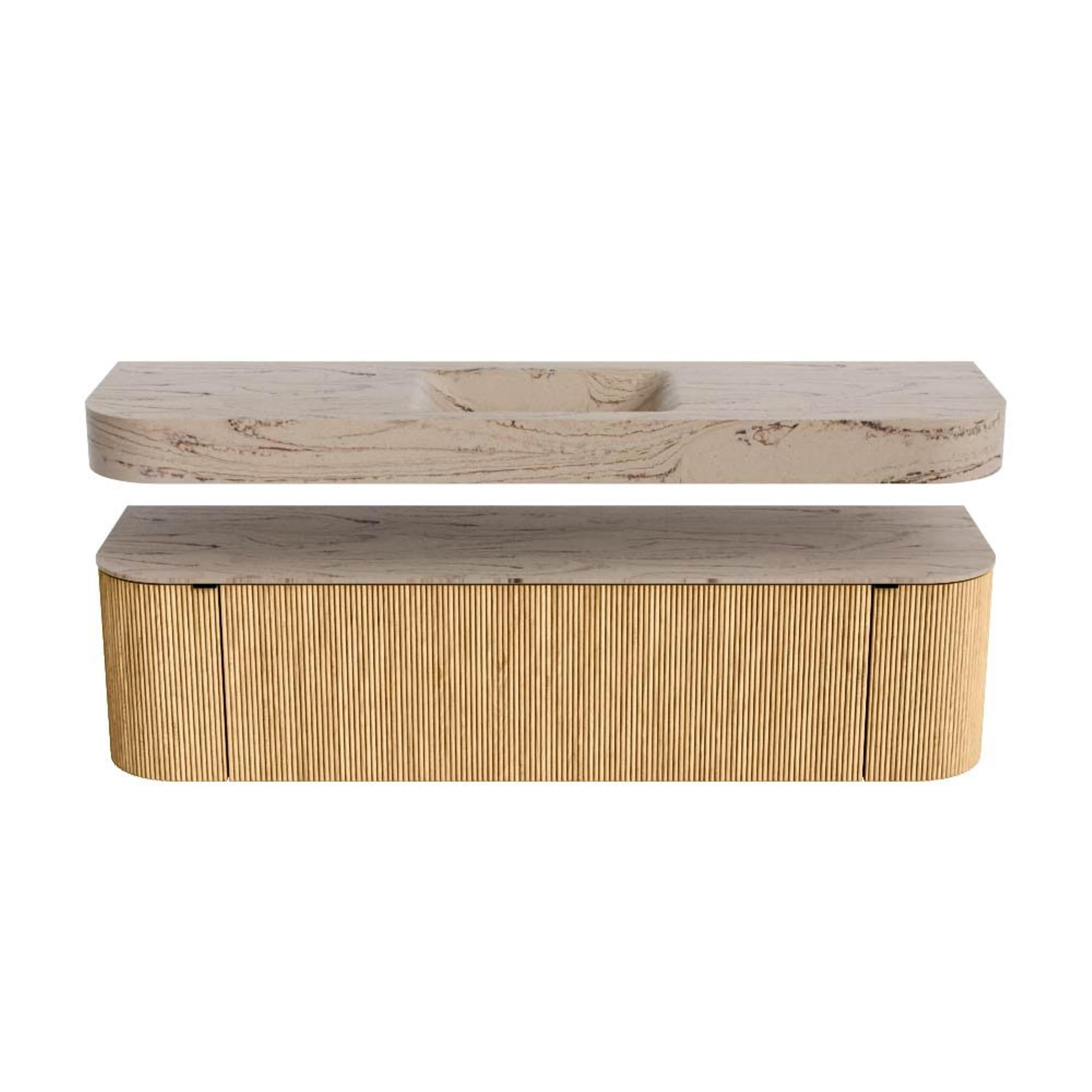 Boven het meubel zweeft een bijpassende, vrij hangende wastafel met afgeronde hoeken – perfect afgestemd op de vorm van de kast. De wastafel is uitgevoerd in Solid Surface en volgt subtiel de lijnen van het onderliggende meubel, waardoor een harmonieus geheel ontstaat. Het Solid Surface topblad vormt een sterke, onderhoudsvriendelijke basis en maakt de combinatie compleet.