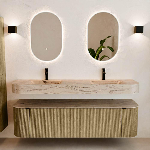 Natuurlijke materialen in warme tinten. De verticale ribbels brengen ritme en textuur in het ontwerp, terwijl het eikenhout zorgt voor een warme, ambachtelijke uitstraling. Kies uit 5 houttinten OAK, WALNUT, DUSK, SHADOW en RUBY zorgvuldig geselecteerde houtkleuren om zowel moderne als klassieke badkamers te verrijken.