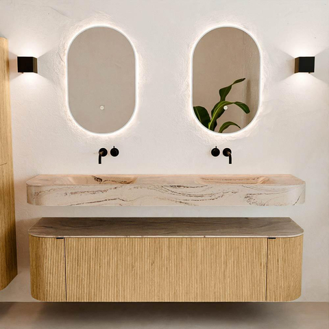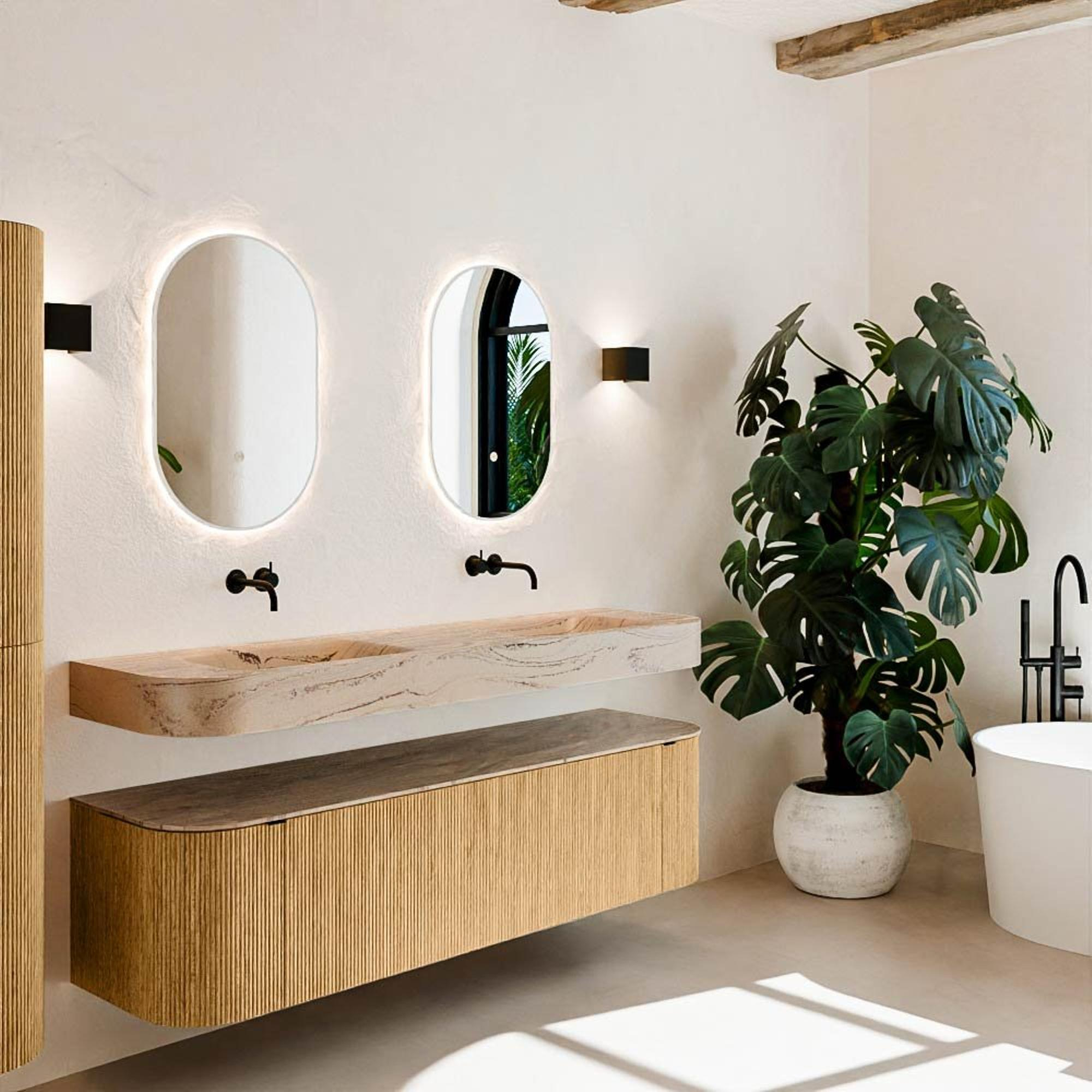 Natuurlijke materialen in warme tinten. De verticale ribbels brengen ritme en textuur in het ontwerp, terwijl het eikenhout zorgt voor een warme, ambachtelijke uitstraling. Kies uit 5 houttinten OAK, WALNUT, DUSK, SHADOW en RUBY zorgvuldig geselecteerde houtkleuren om zowel moderne als klassieke badkamers te verrijken.