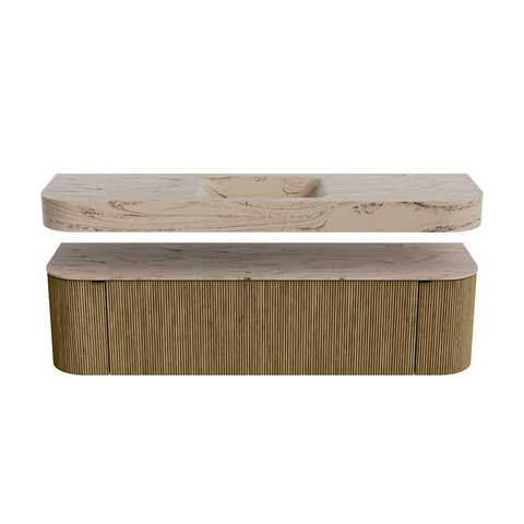 Boven het meubel zweeft een bijpassende, vrij hangende wastafel met afgeronde hoeken – perfect afgestemd op de vorm van de kast. De wastafel is uitgevoerd in Solid Surface en volgt subtiel de lijnen van het onderliggende meubel, waardoor een harmonieus geheel ontstaat. Het Solid Surface topblad vormt een sterke, onderhoudsvriendelijke basis en maakt de combinatie compleet.