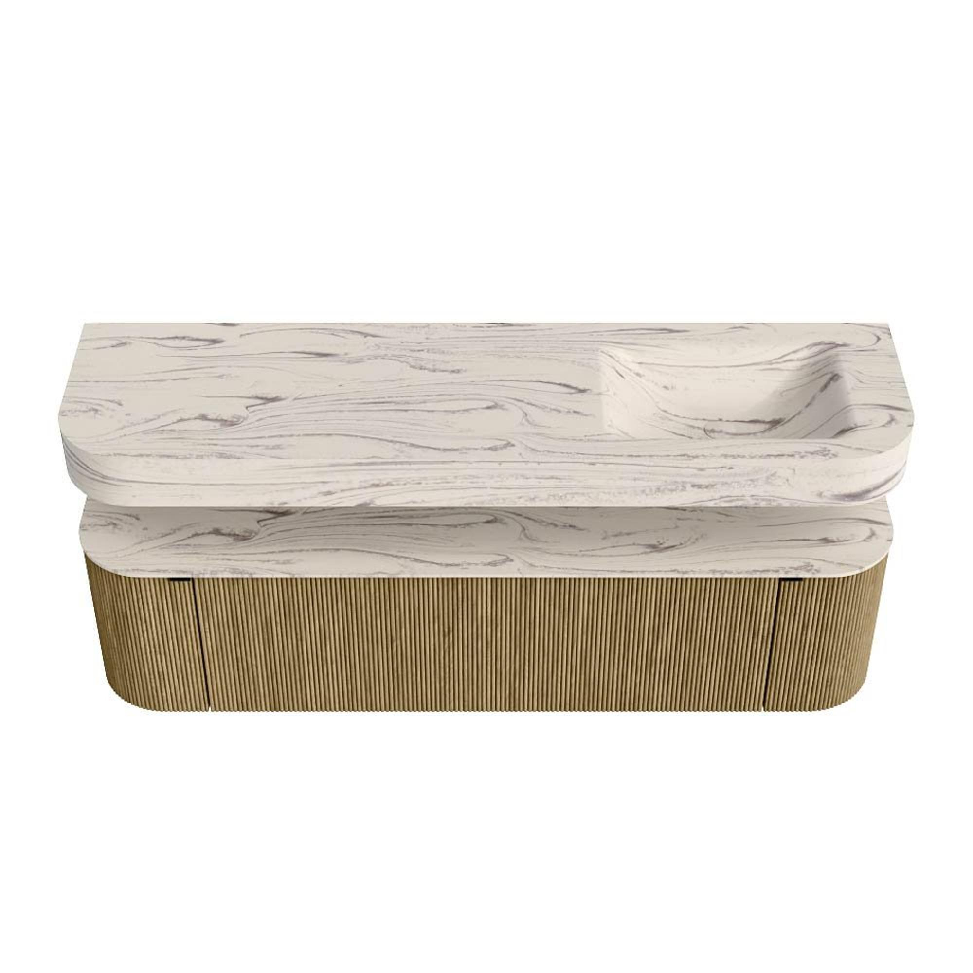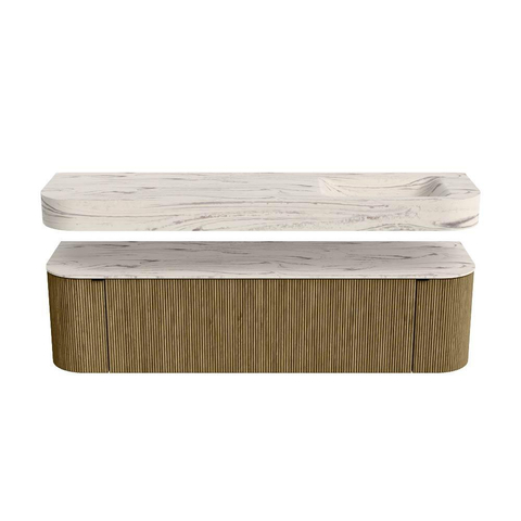 Boven het meubel zweeft een bijpassende, vrij hangende wastafel met afgeronde hoeken – perfect afgestemd op de vorm van de kast. De wastafel is uitgevoerd in Solid Surface en volgt subtiel de lijnen van het onderliggende meubel, waardoor een harmonieus geheel ontstaat. Het Solid Surface topblad vormt een sterke, onderhoudsvriendelijke basis en maakt de combinatie compleet.