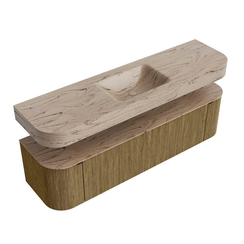 Boven het meubel zweeft een bijpassende, vrij hangende wastafel met afgeronde hoeken – perfect afgestemd op de vorm van de kast. De wastafel is uitgevoerd in Solid Surface en volgt subtiel de lijnen van het onderliggende meubel, waardoor een harmonieus geheel ontstaat. Het Solid Surface topblad vormt een sterke, onderhoudsvriendelijke basis en maakt de combinatie compleet.