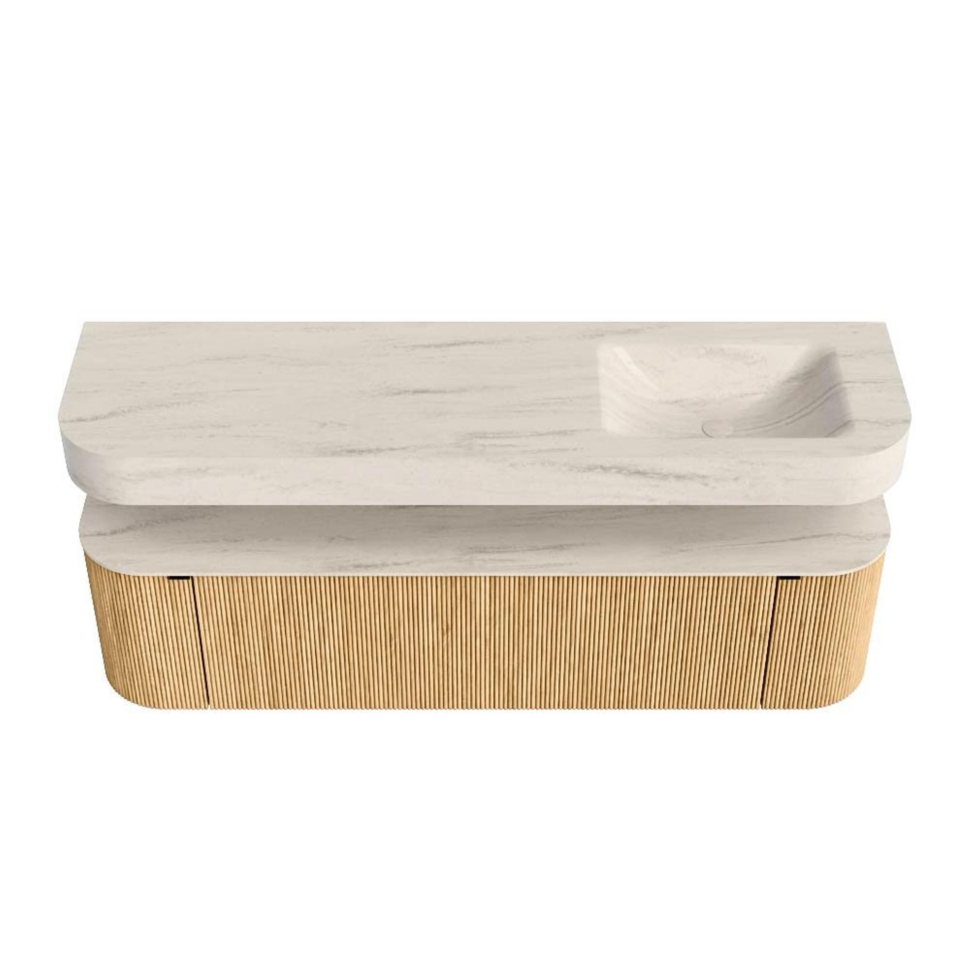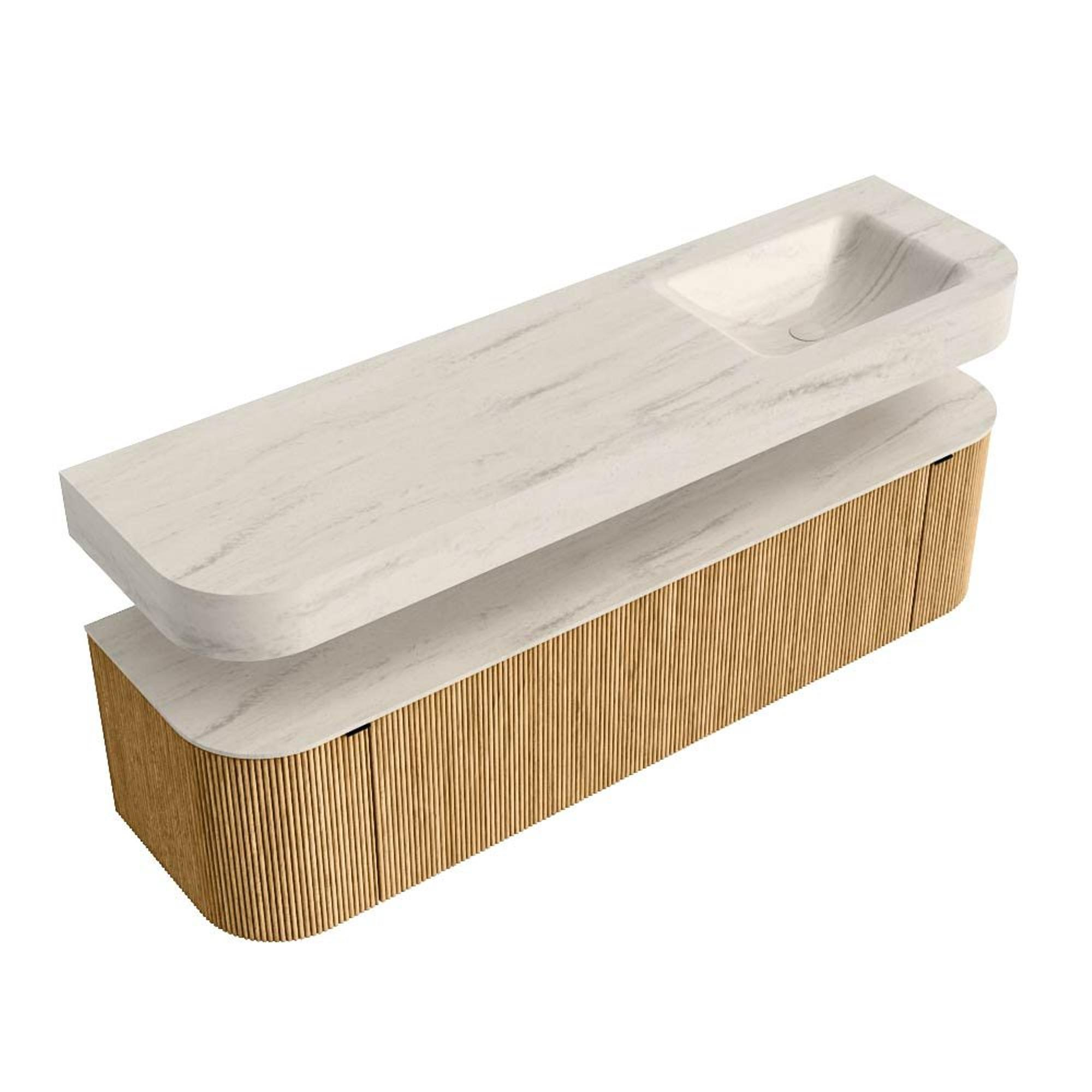 MONDIAZ THOR-DLUX 170cm badmeubel ronding links + rechts kleur Oak met 1 lade en 2 deuren. Vrijhangende wastafel CLOUD Rechts 1 kraangat kleur Meli.