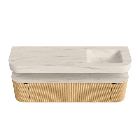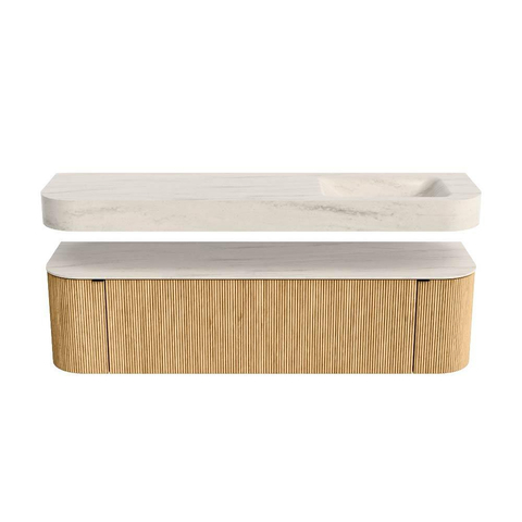 Boven het meubel zweeft een bijpassende, vrij hangende wastafel met afgeronde hoeken – perfect afgestemd op de vorm van de kast. De wastafel is uitgevoerd in Solid Surface en volgt subtiel de lijnen van het onderliggende meubel, waardoor een harmonieus geheel ontstaat. Het Solid Surface topblad vormt een sterke, onderhoudsvriendelijke basis en maakt de combinatie compleet.