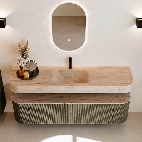 Natuurlijke materialen in warme tinten. De verticale ribbels brengen ritme en textuur in het ontwerp, terwijl het eikenhout zorgt voor een warme, ambachtelijke uitstraling. Kies uit 5 houttinten OAK, WALNUT, DUSK, SHADOW en RUBY zorgvuldig geselecteerde houtkleuren om zowel moderne als klassieke badkamers te verrijken.